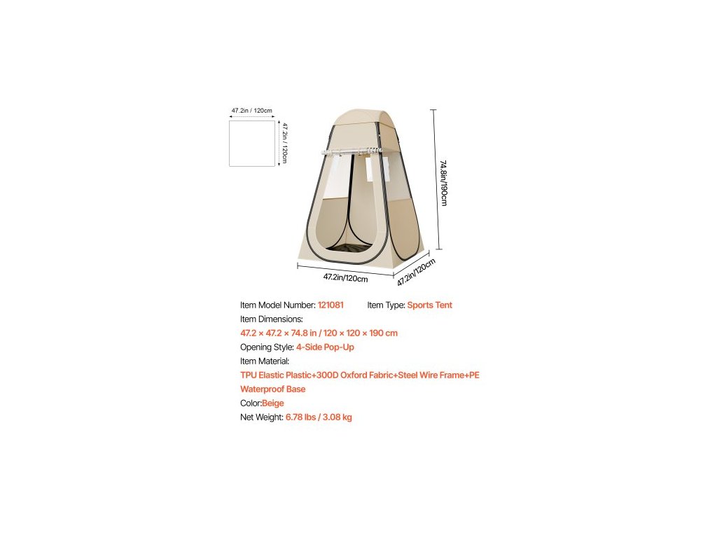 Způsob otevírání: 4stranný Pop-up,Materiál výrobku: Plochý ocelový drát + 0,15 mm TPU + 210D oxfordská tkanina,Hlavní materiály: TPU plast + 190T polyesterová tkanina + ocelový drátěný rám,Barva: Béžová,Číslo modelu výrobku: 121081,Rozměry výrobku: 47,24 × 47,24 × 74,80 palců / 1200 × 1200 × 1900 mm,Typ výrobku: Sportovní Stan, Čistá hmotnost: 6,78 lbs / 3,08 kg