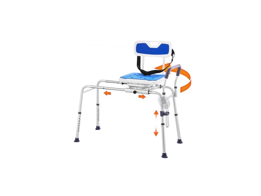 Posuvná vanová lavice s otočným sedákem o 360 stupňů, výškově nastavitelná vanová lavice s loketní opěrkou a bezpečnostním pásem, protiskluzová otočná sprchová židle pro seniory s postižením, nosnost 180 kgNastavitelná výška