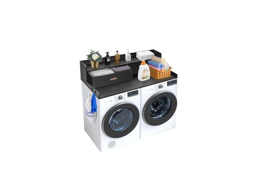 Pracovní deska pro pračku a sušičku se 2 zásuvkami a 2patrovou policí, dřevěná pracovní deska pro pračku a sušičku o rozměrech 54" x 27" s protiskluzovými podložkami, voděodolná vrchní deska na prádlo pro organizaci prádelny, černáMultifunkční velká plocha