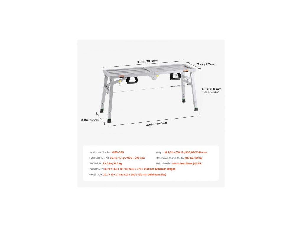 Číslo modelu položky: WBS-020,Maximální nosnost: 180 kg,Rozměry ve složeném stavu: 525 x 380 x 135 mm (minimální velikost),Výška: 500/620/740 mm,Rozměry stolu (D x Š): 1000 x 290 mm mm, Čistá hmotnost: 10,8 kg, Hlavní materiál: Pozinkovaný plech (Q235), Rozměry výrobku: 1040 x 375 x 500 mm (minimální výška)