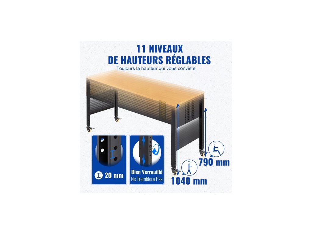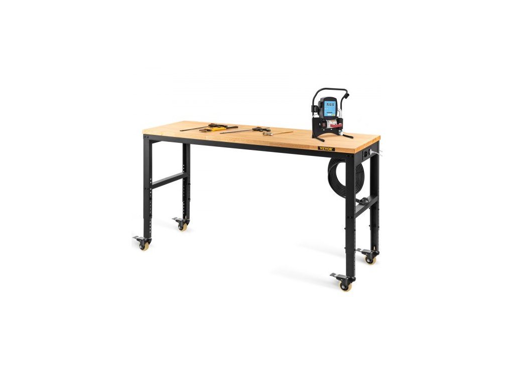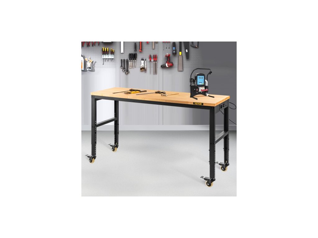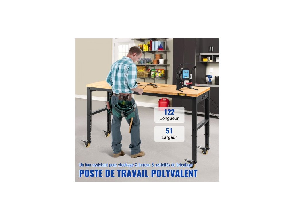 Pracovní stůl s nastavitelnou výškou, 122 cm Š x 51 cm H x 104 cm V, garážový stůl s výškou 79–104 cm a nosností 720 kg, se zásuvkami, dřevěnou deskou, kovovým rámem a otočnými kolečky, pro kancelář a domácnostPerfektní pracovní stanice