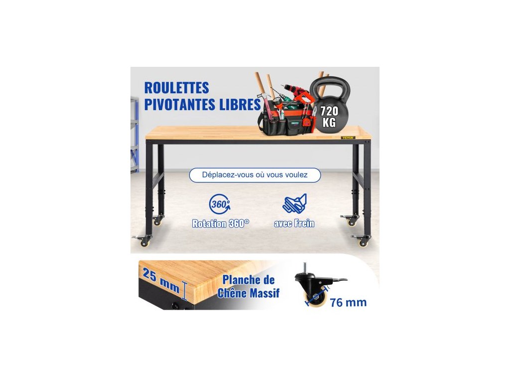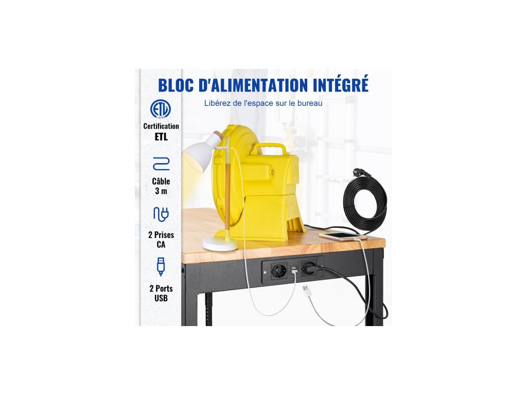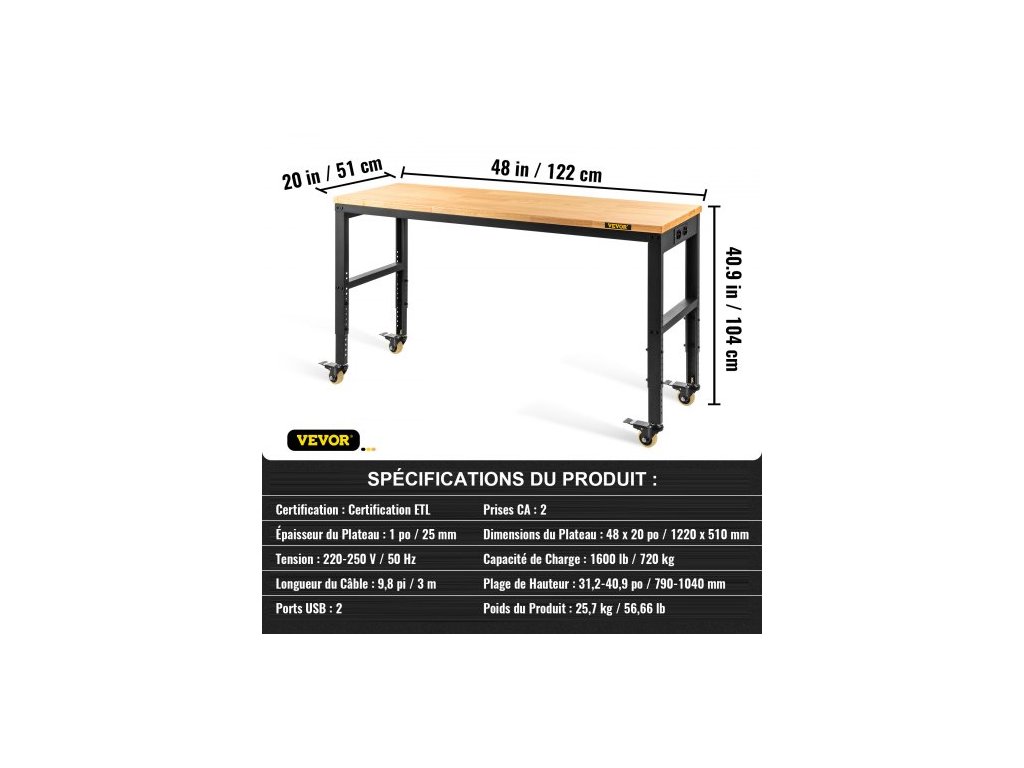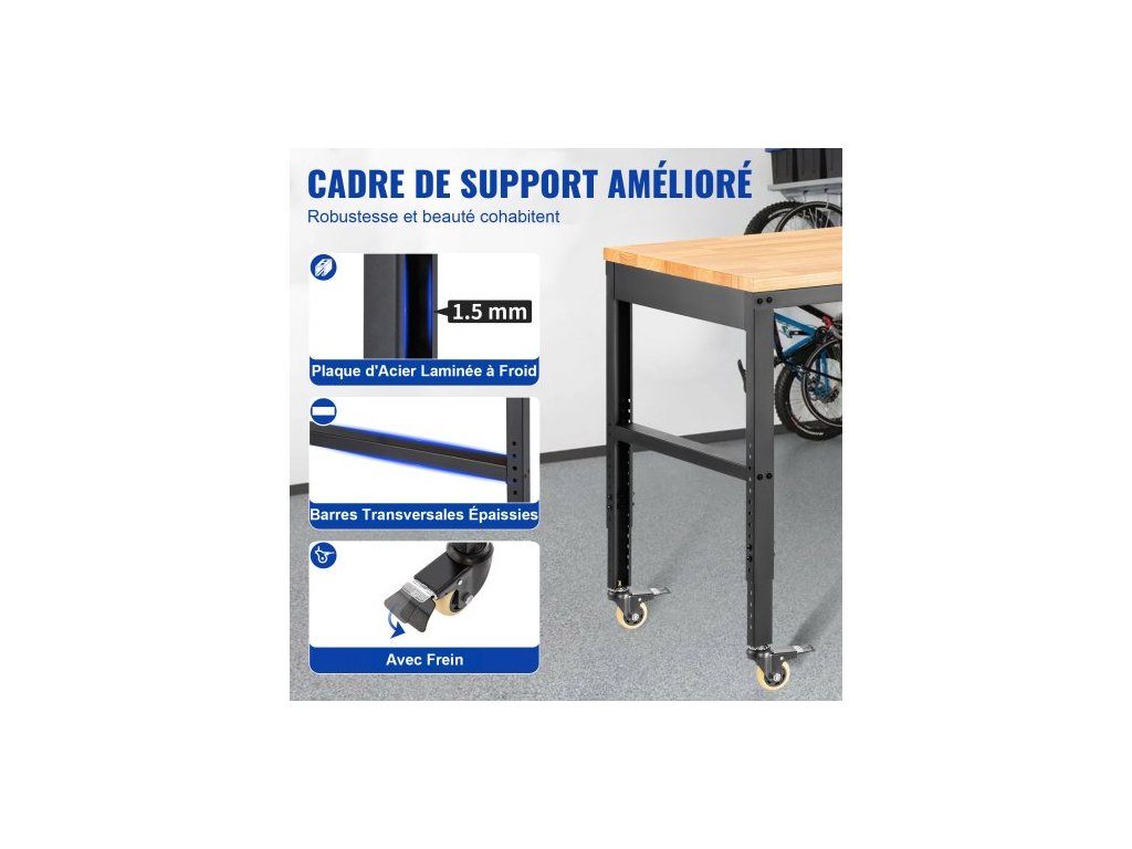 Pracovní stůl s nastavitelnou výškou, 122 cm Š x 51 cm H x 104 cm V, garážový stůl s výškou 79–104 cm a nosností 720 kg, se zásuvkami, dřevěnou deskou, kovovým rámem a otočnými kolečky, pro kancelář a domácnostPerfektní pracovní stanice