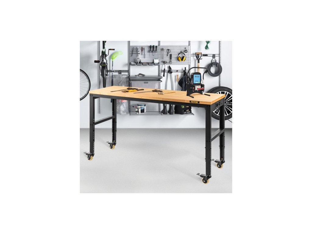 Pracovní stůl s nastavitelnou výškou, 155 x 51 cm, garážový stůl s výškou 80–105 cm a nosností 720 kg, se zásuvkami, dřevěnou deskou, kovovým rámem a otočnými kolečky, pro kancelář, domácí dílnu