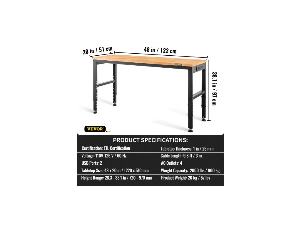 Rozměry desky stolu: 1220 x 508 mm,Počet otvorů pro nastavení: 12,Barva: Hnědá,Rozměry výrobku: 1220 x 508 x 968 mm,Materiál desky stolu: Dubové prkno,Tloušťka desky stolu: 25 mm,Tloušťka stěny trubky: 1,5 mm,Nosnost: 900 kg,Rozsah výšky: 719–968 mm,Číslo modelu položky: M4820,Hmotnost výrobku: 23 kg,Materiál rámu: Ocel válcovaná za studena,Kabel Délka: 3 m