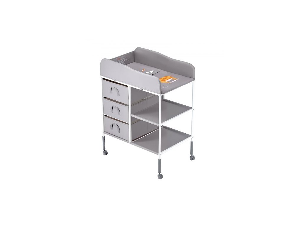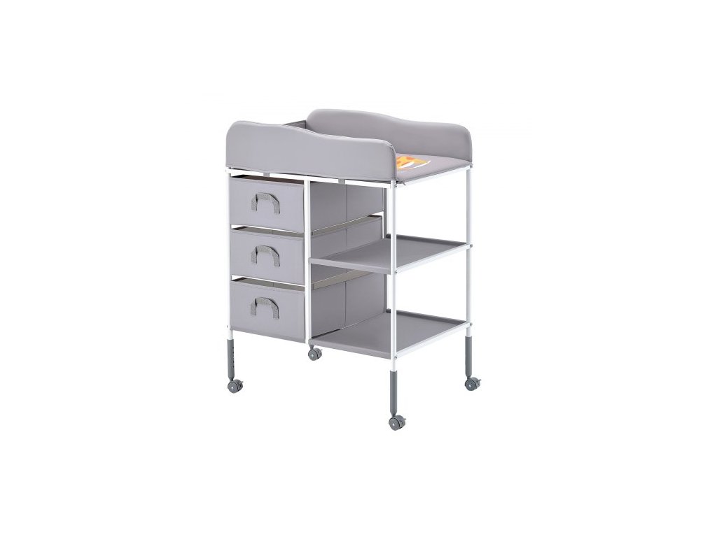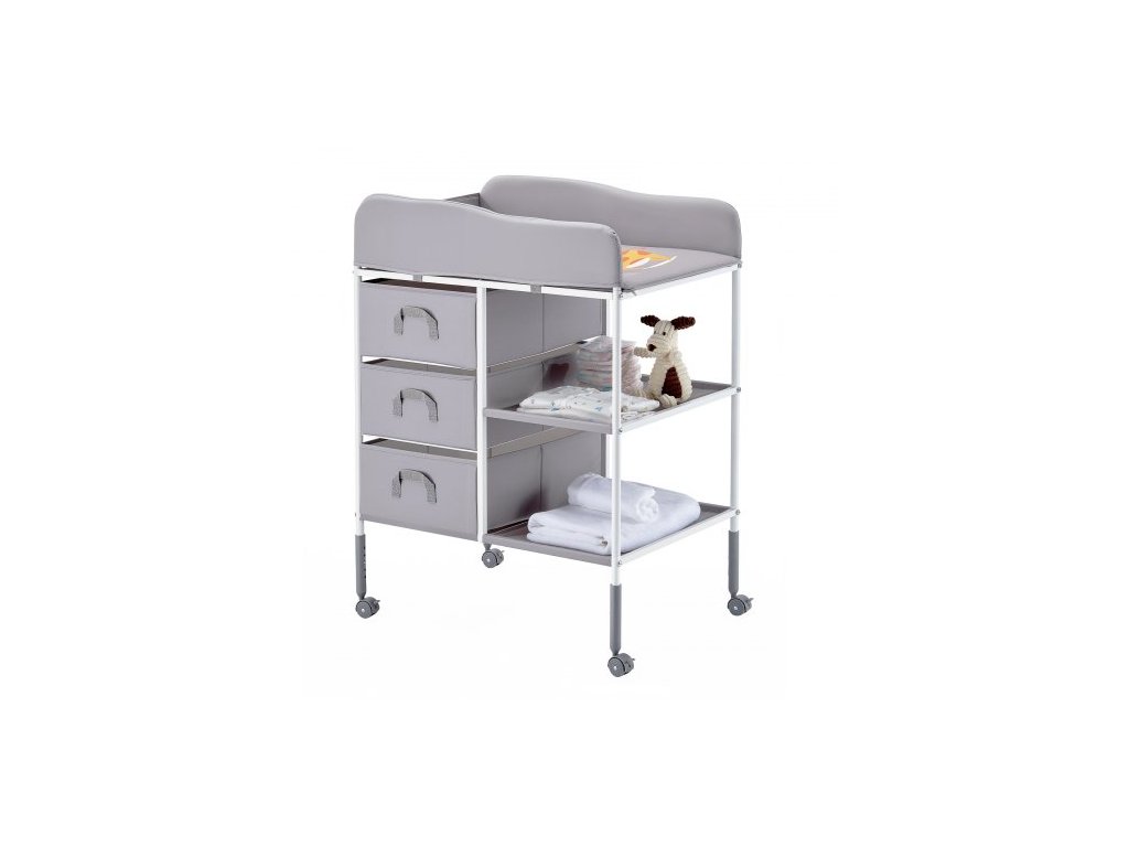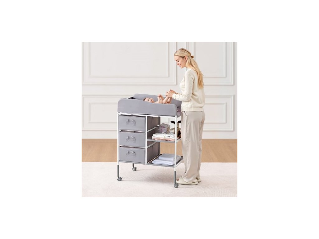 Přebalovací pult pro děti, přenosná přebalovací stanice se 3 látkovými zásuvkami a uzamykatelnými kolečky, nastavitelná výška, multifunkční přebalovací pult s úložným prostorem, dětská postel, šedáNastavitelné nastavení výšky