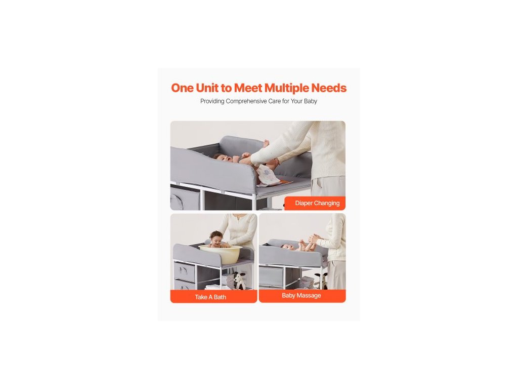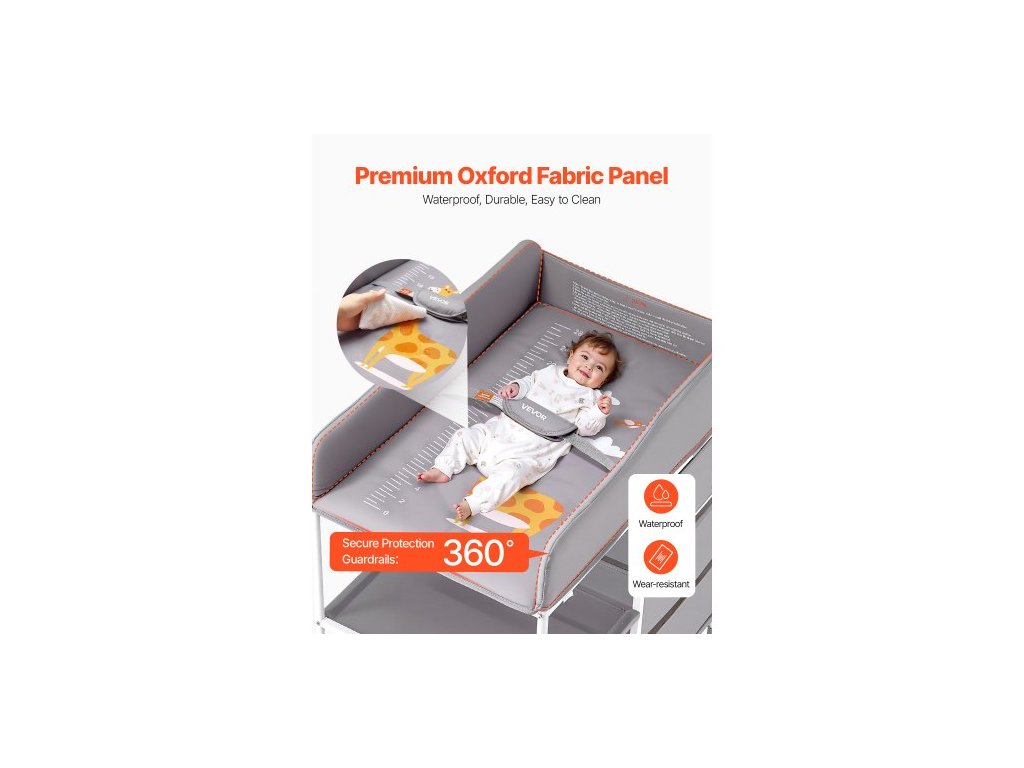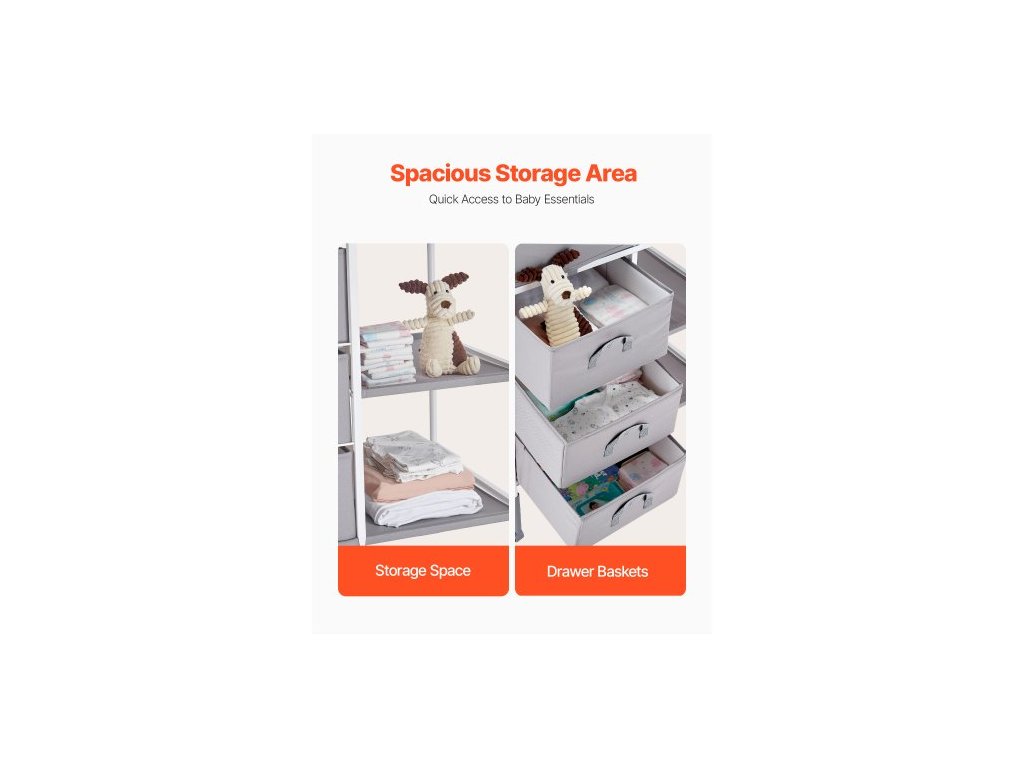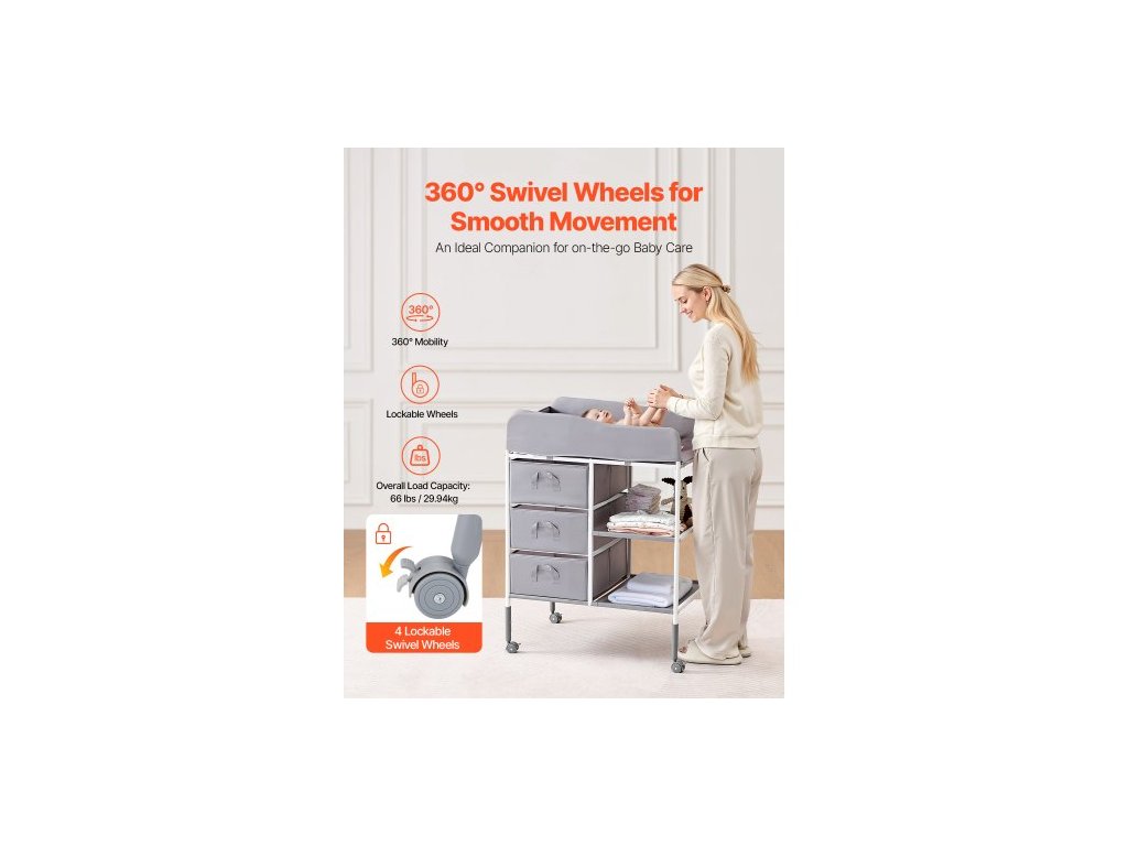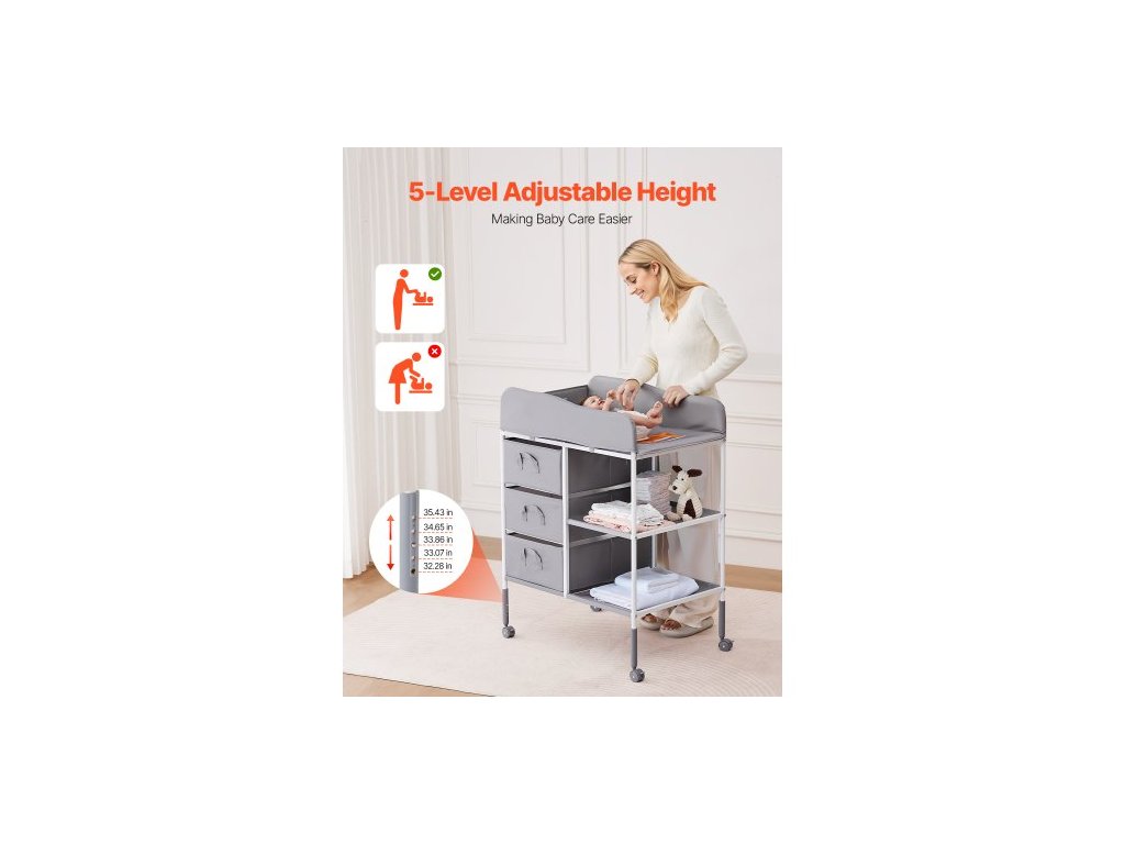 Přebalovací pult pro děti, přenosná přebalovací stanice se 3 látkovými zásuvkami a uzamykatelnými kolečky, nastavitelná výška, multifunkční přebalovací pult s úložným prostorem, dětská postel, šedáNastavitelné nastavení výšky