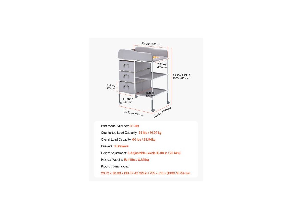 Nastavení výšky: 5 nastavitelných úrovní (0,98 palce / 25 mm),Nosnost: 66 lbs / 29,94 kg,Číslo modelu položky: CT-08,Hmotnost výrobku: 18,41 lbs / 8,35 kg,Zásuvky: 3 zásuvky,Rozměry výrobku: 29,72 x 20,08 x (39,37-42,32) palce / 755 x 510 x (1000-1075) mm