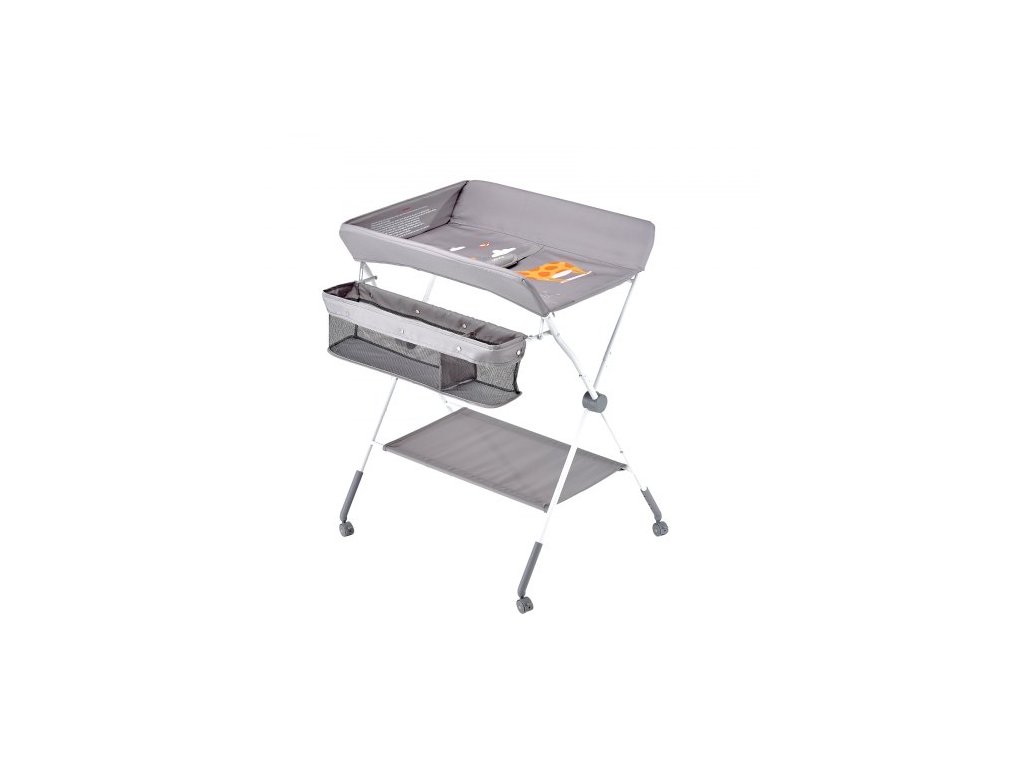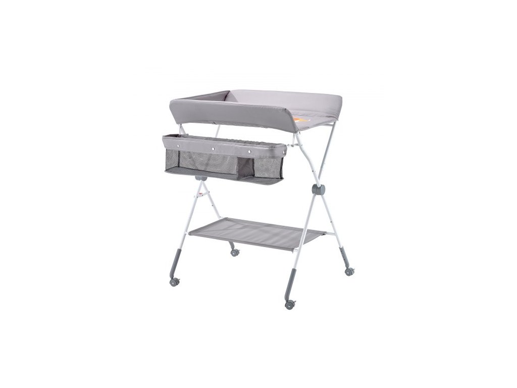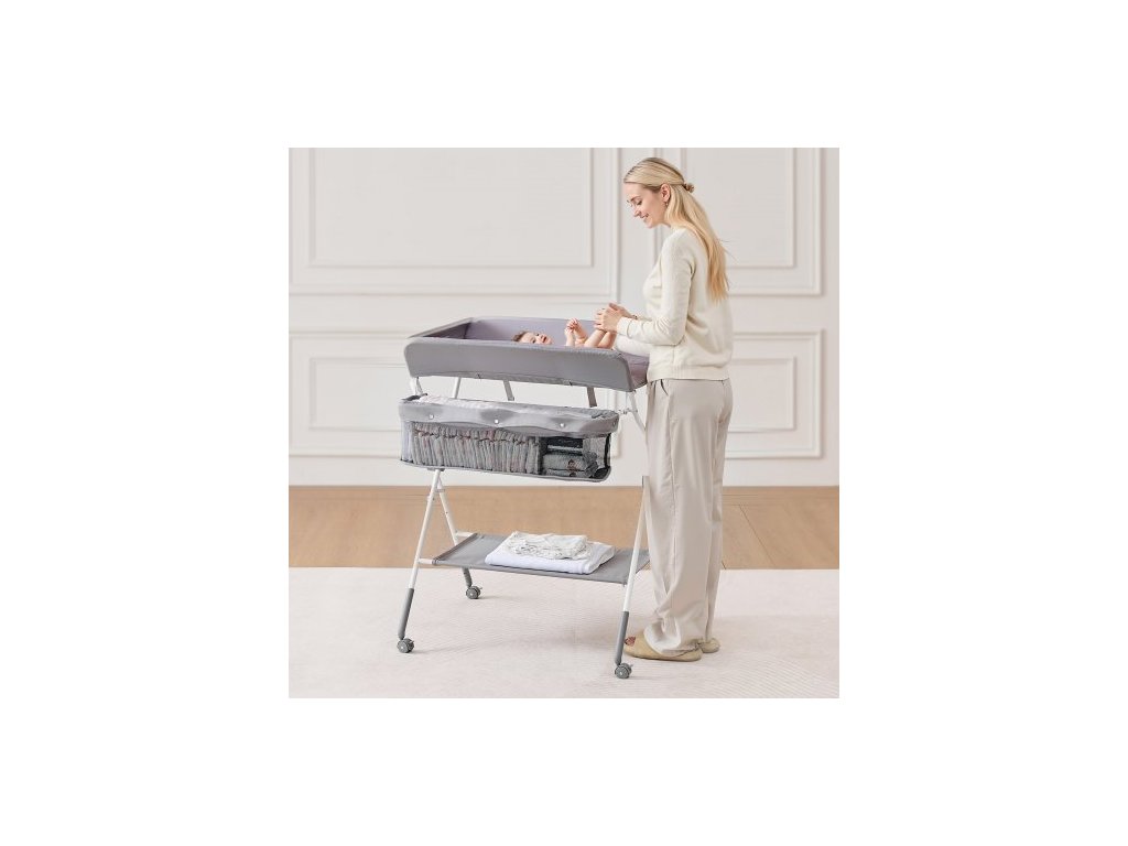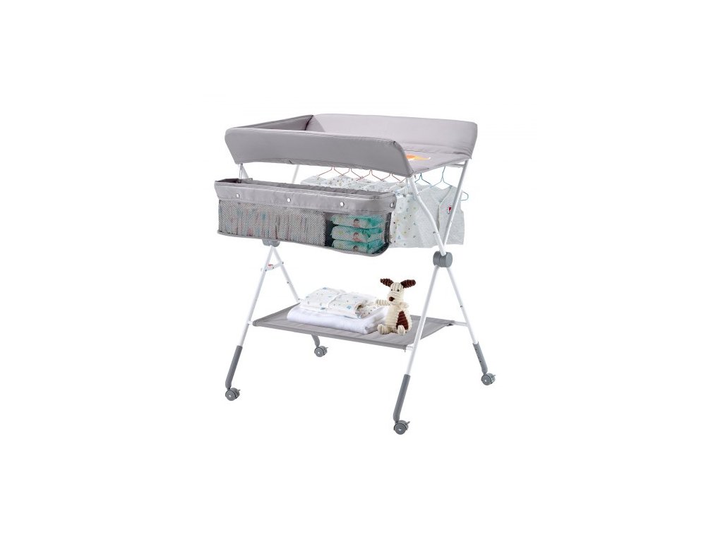 Přebalovací pult pro děti, skládací přebalovací stanice s bočním košíkem, přenosný přebalovací pult s nastavitelnou výškou a uzamykatelnými kolečky, multifunkční úložný organizér do dětského pokoje, světle šedýPřenosný skládací design