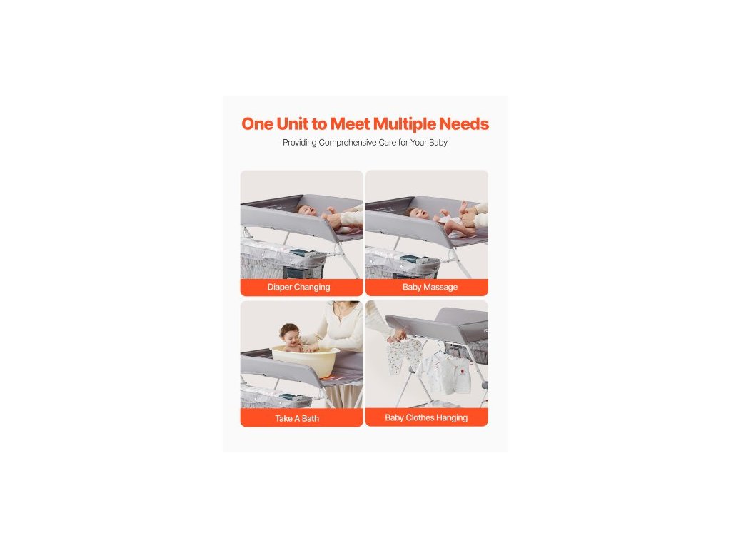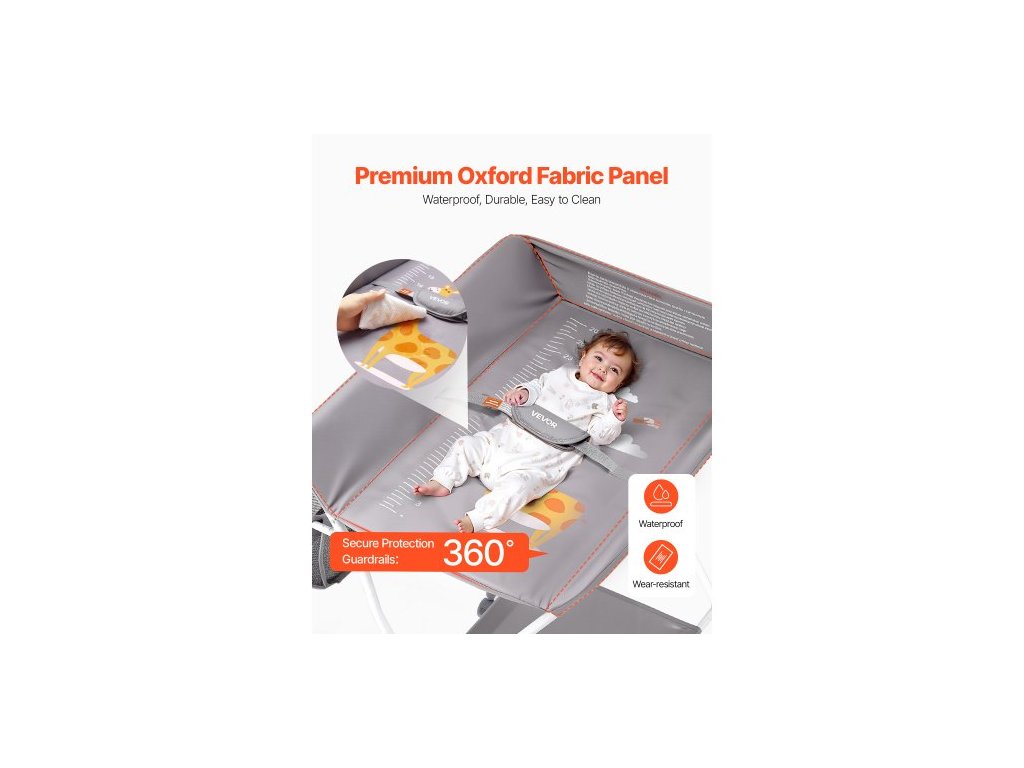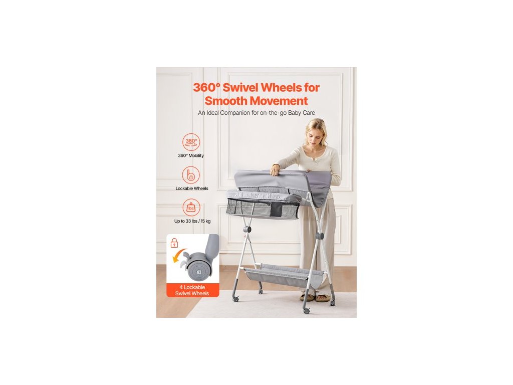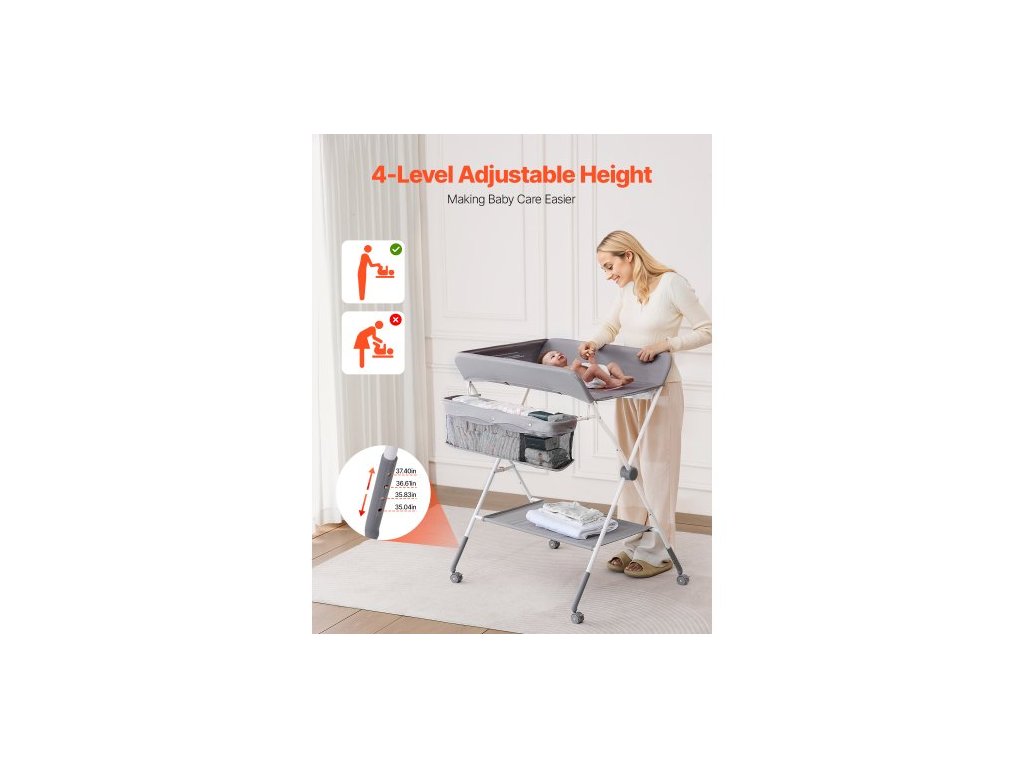 Přebalovací pult pro děti, skládací přebalovací stanice s bočním košíkem, přenosný přebalovací pult s nastavitelnou výškou a uzamykatelnými kolečky, multifunkční úložný organizér do dětského pokoje, světle šedýPřenosný skládací design