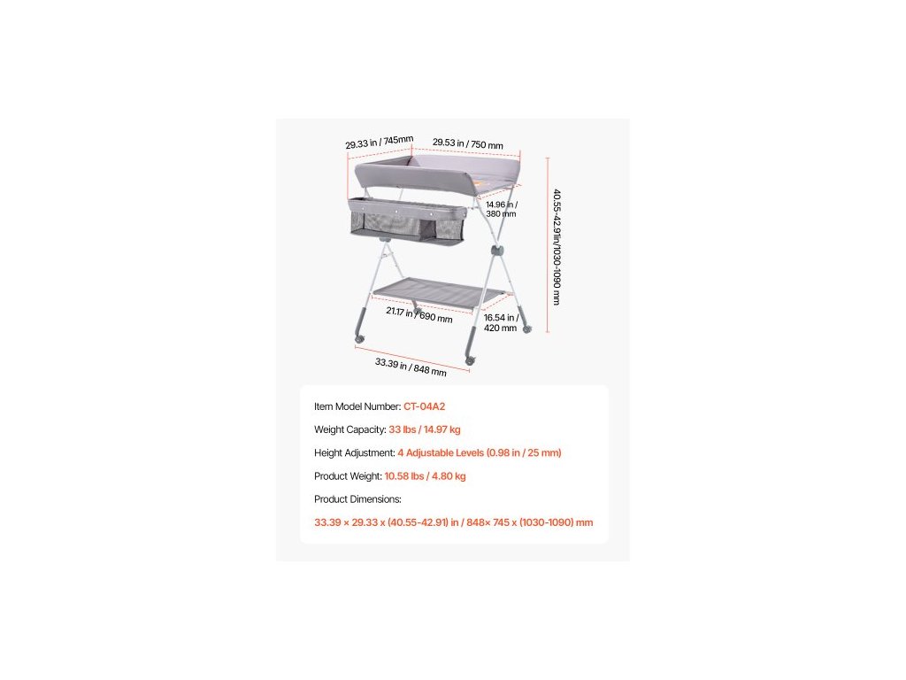 Nastavení výšky: 4 nastavitelné úrovně (0,98 palce / 25 mm),Nosnost: 33 lbs / 14,97 kg,Číslo modelu položky: CT-04A2,Hmotnost výrobku: 10,58 lbs / 4,80 kg,Rozměry výrobku: 33,39 x 29,33 x (40,55-42,91) palce / 848 x 745 x (1030-1090) mm
