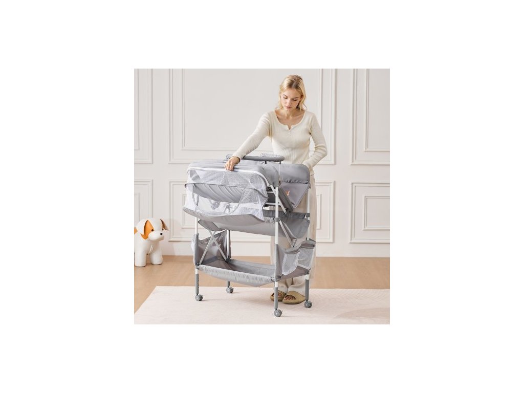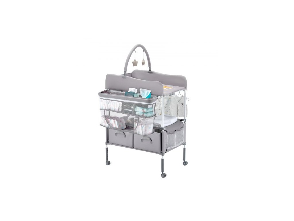 Přebalovací pult pro děti, skládací přebalovací stanice se 2 zásuvkami na látky, boční košík a závěsná tyč, přenosný přebalovací pult s nastavitelnou výškou, uzamykatelnými kolečky a 2 hračkami ve tvaru hvězdy, světle šedýPřenosný skládací design