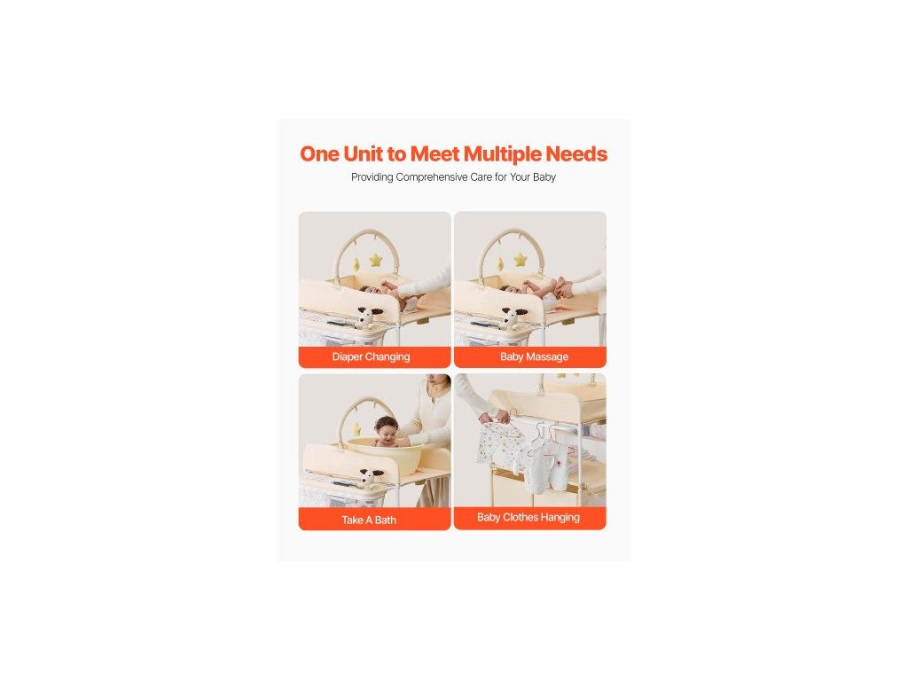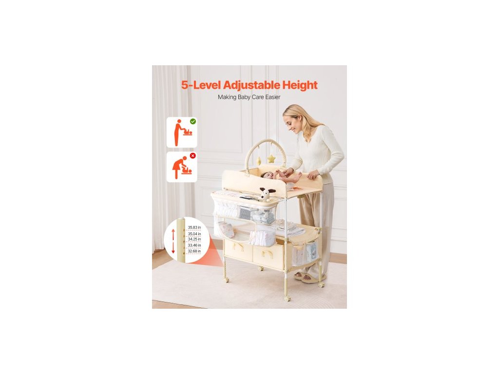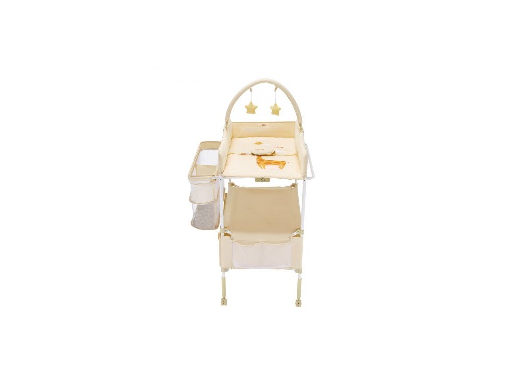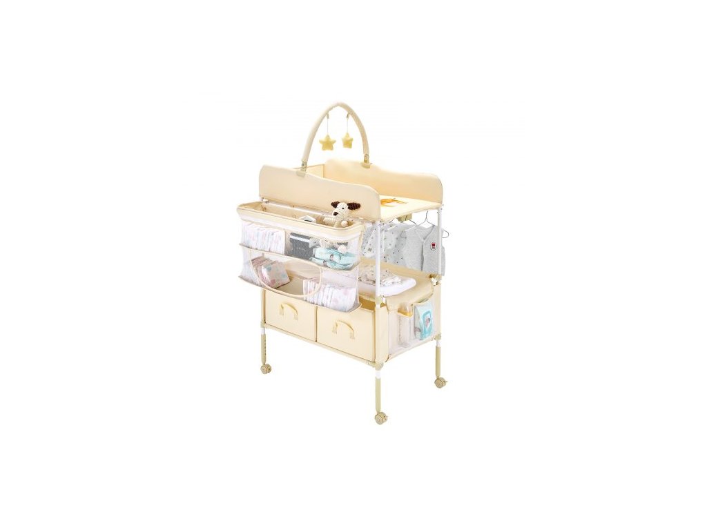Přebalovací pult pro miminka, skládací přebalovací stanice se 2 zásuvkami na látky, boční košík a závěsná tyč, přenosný přebalovací pult s nastavitelnou výškou, uzamykatelnými kolečky a 2 hračkami ve tvaru hvězdy, světle béžová