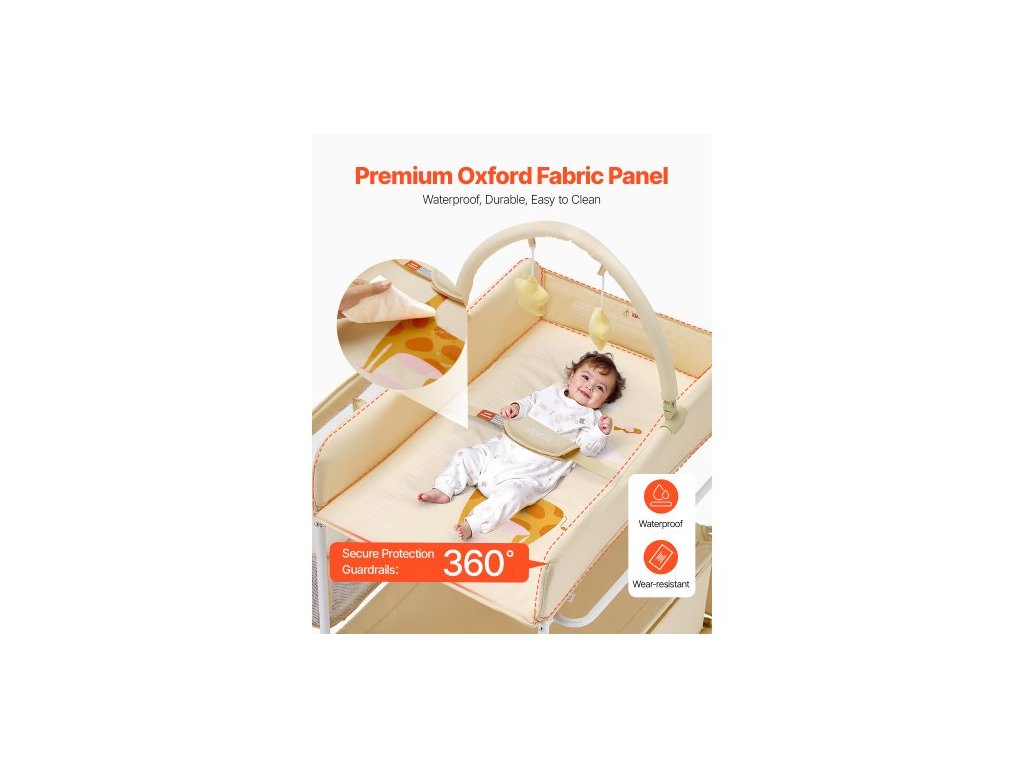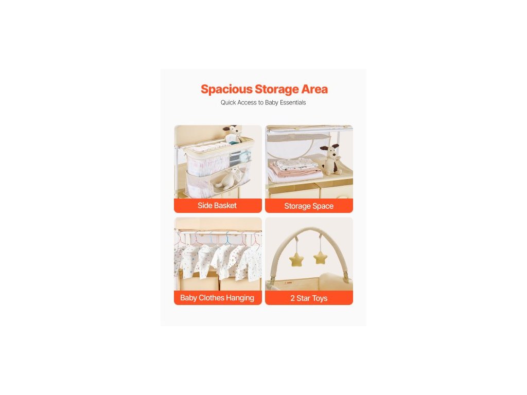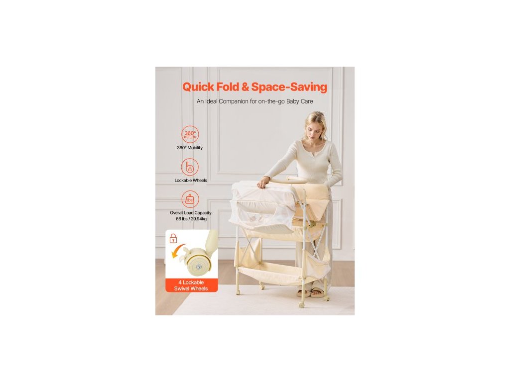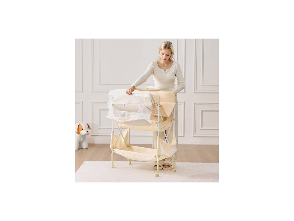 Přebalovací pult pro děti, skládací přebalovací stanice se 2 látkovými zásuvkami, boční košík a závěsná tyč, přenosný přebalovací pult s nastavitelnou výškou, uzamykatelnými kolečky a 2 hračkami ve tvaru hvězdy, světle béžováPřenosný skládací design