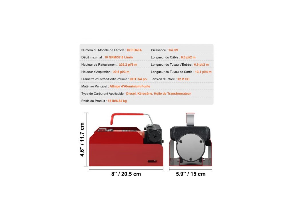 Sací výška: ≥3 m,Délka výstupní hadice: 4 m,Použitelný typ paliva: Nafta, petrolej, transformátorový olej,Vstupní napětí: DC 12V,Maximální průtok: 37,8 l/min,Rozměry výrobku (D x Š x V): 20,5 x 15 x 11,7 cm,Zdvih hlavy: 8 m,Výkon: 1/4 HP,Průměr vstupu/výstupu oleje: GHT 3/4 palce,Číslo modelu položky: DCFD40A,Hmotnost výrobku: 6,82 kg,Délka kabelu: 6,6 2 m, Hlavní materiál: Hliníková slitina/litina, Délka přívodní hadice: 2 m