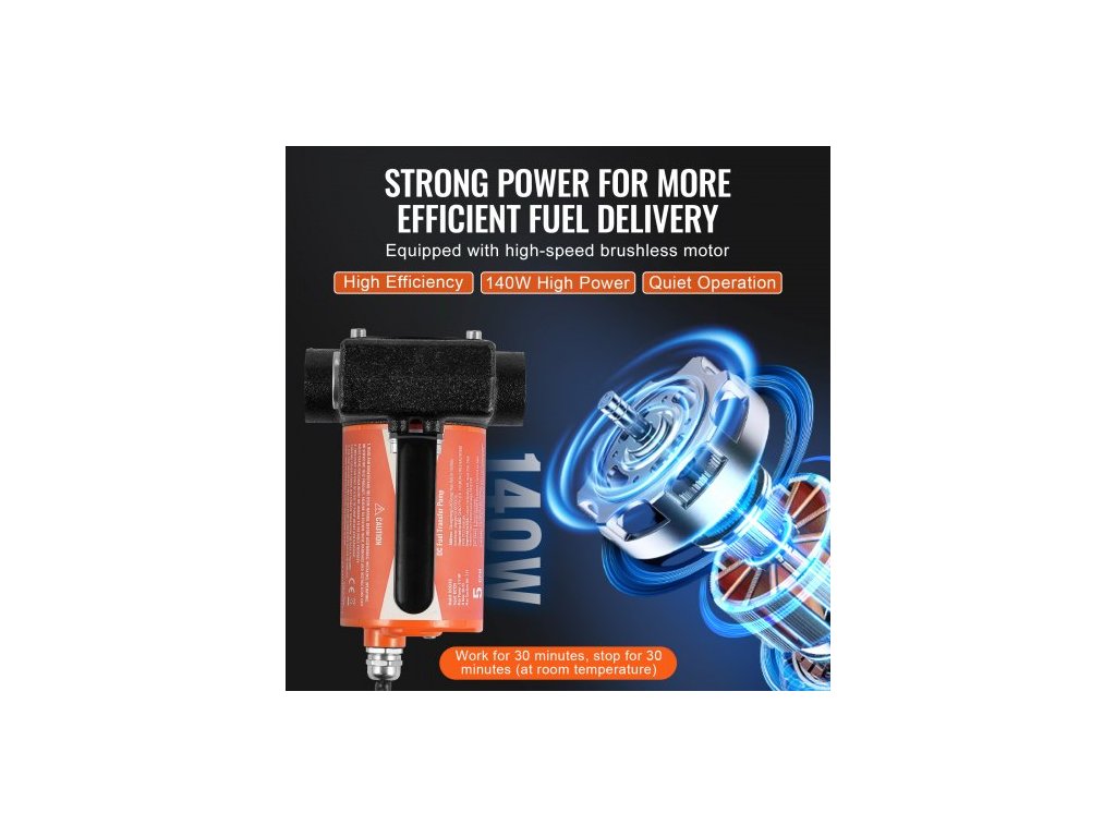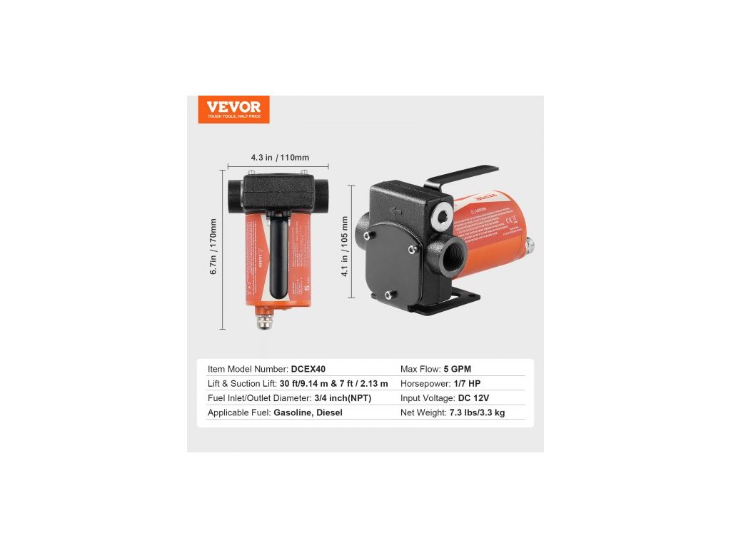 Použitelné palivo: benzín, nafta, Max. průtok: 5 GPM, výkon v koních: 1/7 HP, číslo modelu položky: DCEX40, vstupní napětí: DC 12V, zdvih a sací výška: 30 stop/9,14 m a 7 stop/2,13 m, průměr vstupu/výstupu paliva: NTP3/4, čistá hmotnost: 7,2 lbs/3,25 kg