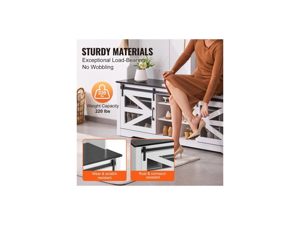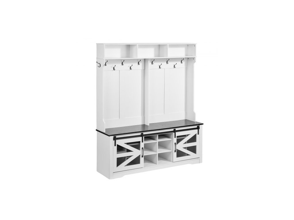 Počet horních úložných přihrádek: 3,Barva: Tělo: Bílá; Sedák: Černá, Číslo modelu: VVSC001, Výška sedáku: 569 mm / 1,86 stopy, Výška sedáku: 569 mm / 1,86 stopy, Rozměry výrobku (včetně háčků a úchytů): 1508 x 420 x 1725 mm / 4,94 x 1,37 x 5,65 stopy, Celková nosnost: 90,718 kg / 200 liber, Počet otvorů na boty: 16, Počet háčků: 12 (včetně 2 bočních háčků), Čistá hmotnost: 59,9 kg / 132,05 liber, Hlavní materiál: Deska: Dřevotříska s dýhou; Kolejnice: Železo, Rozměry balení: 1640 x 470 x 235 mm / 5,38 x 1,54 x 0,77 stopy