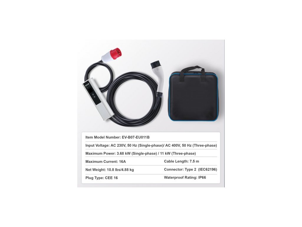 Konektor: Typ 2 (IEC62196), Vodotěsnost: IP66, Maximální výkon: 3,68 kW (jednofázový) / 11 kW (třífázový), Typ zástrčky: CEE 16, Maximální proud: 16A, Číslo modelu položky: EV-B07-EU011B, Vstupní napětí: AC 230V, 50 Hz (jednofázový) / AC 400V, 50 Hz (třífázový), délka kabelu: 7,5 m, hmotnost netto: 4,88 kg
