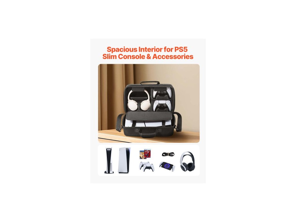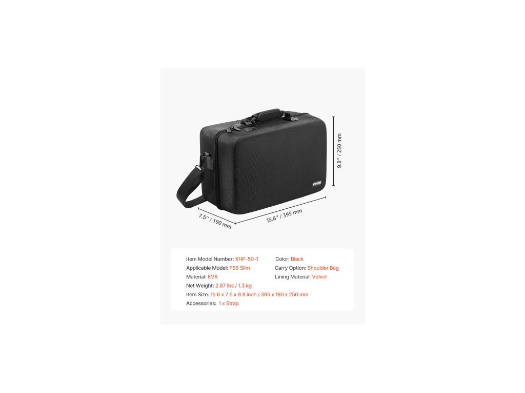 Možnost nošení: Taška přes rameno, Použitelný model: PS5 Slim, Velikost výrobku: 15,6 x 7,5 x 9,8 palce / 395 x 190 x 250 mm, Barva: Černá, Podšívka: Samet, Číslo modelu výrobku: XHP-50-1, Materiál: EVA, Čistá hmotnost: 2,87 lbs / 1,3 kg
