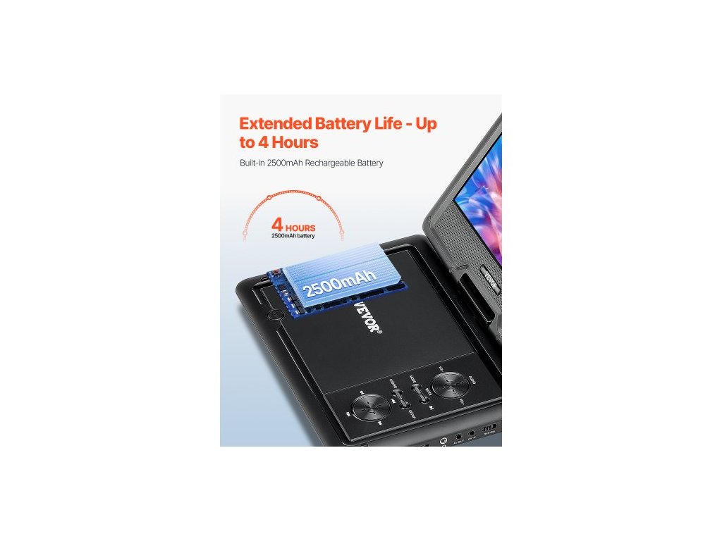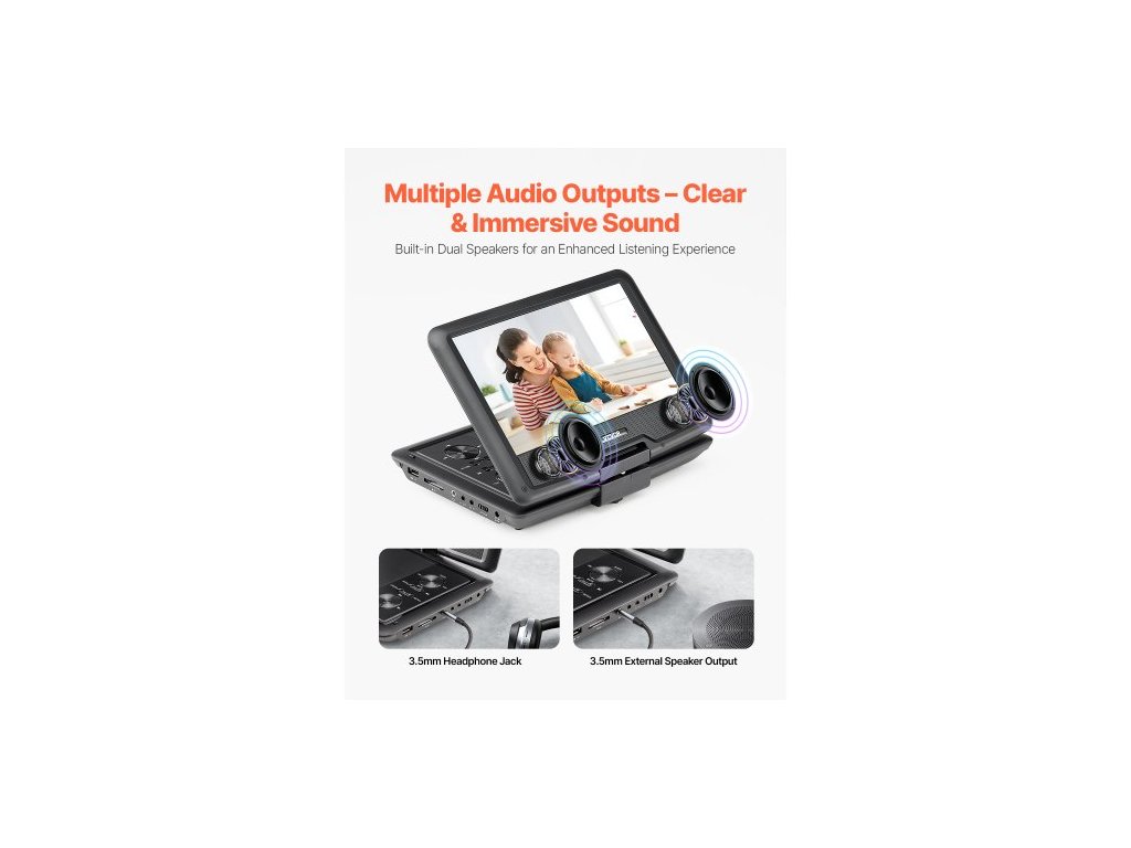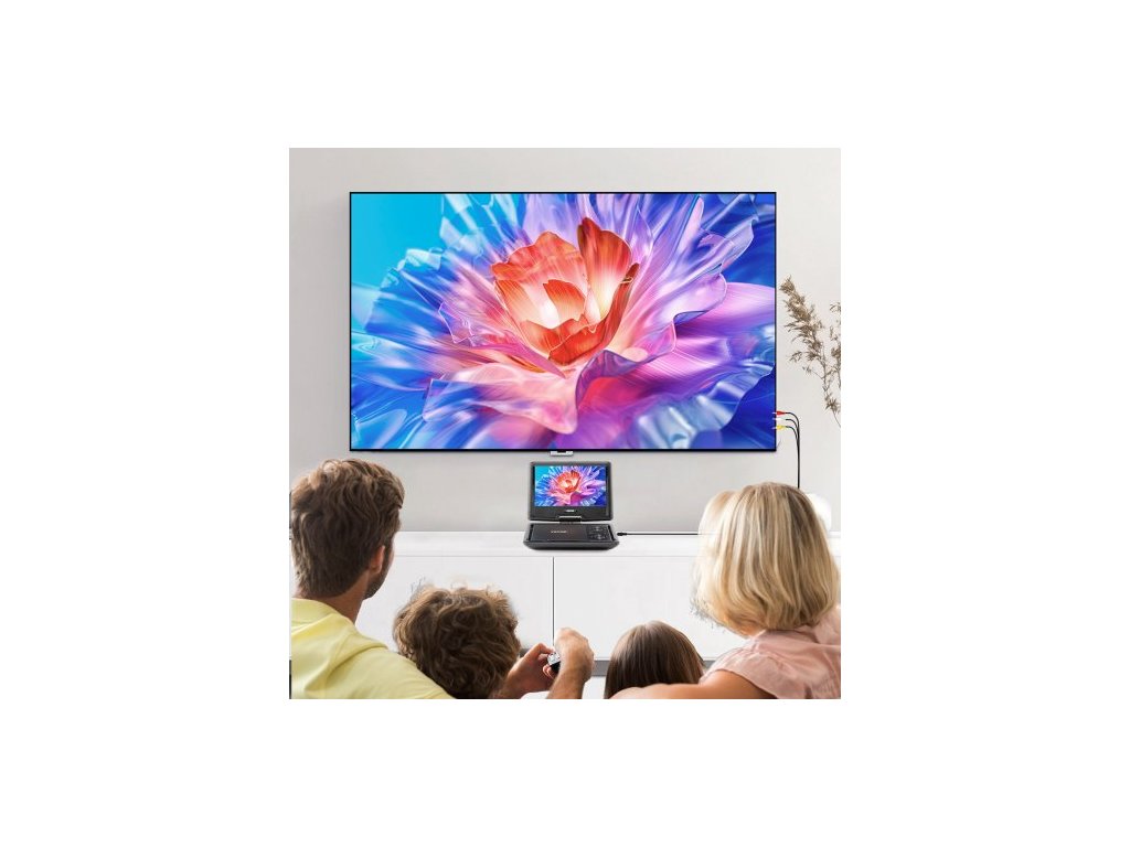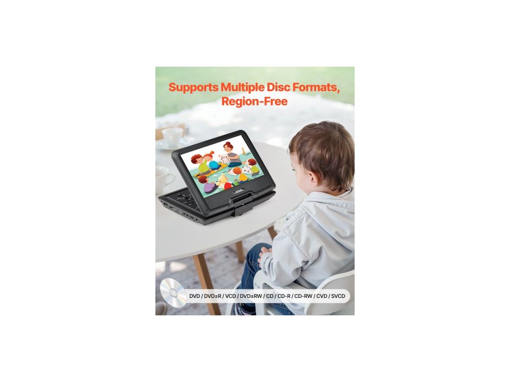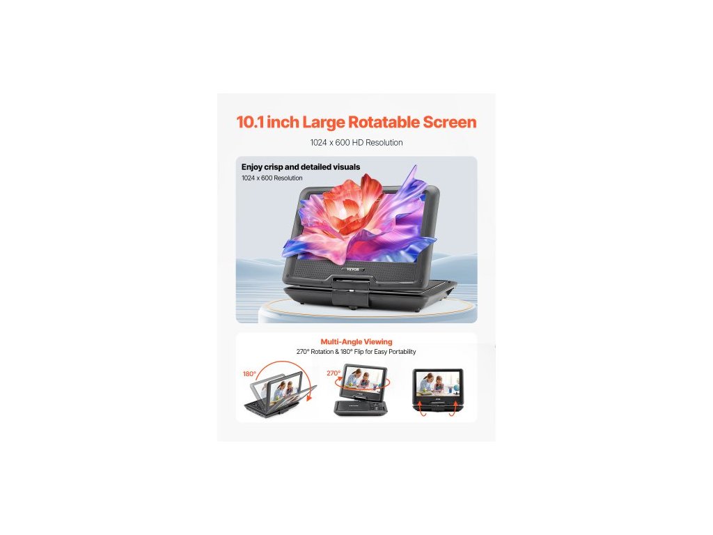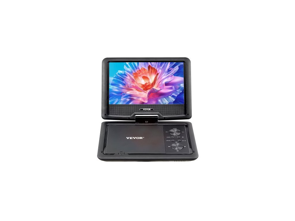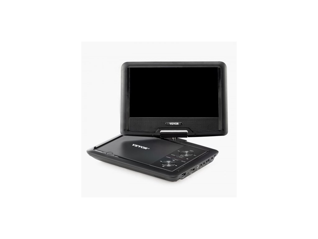 Přenosný DVD přehrávač , otočný 10,1palcový HD displej, vestavěná dobíjecí baterie s výdrží 4 hodiny, dva reproduktory, podpora synchronizace TV/USB/SD karty/CD/DVD, nabíječka do auta, napájecí adaptér, dálkové ovládáníPřenosný DVD přehrávač
