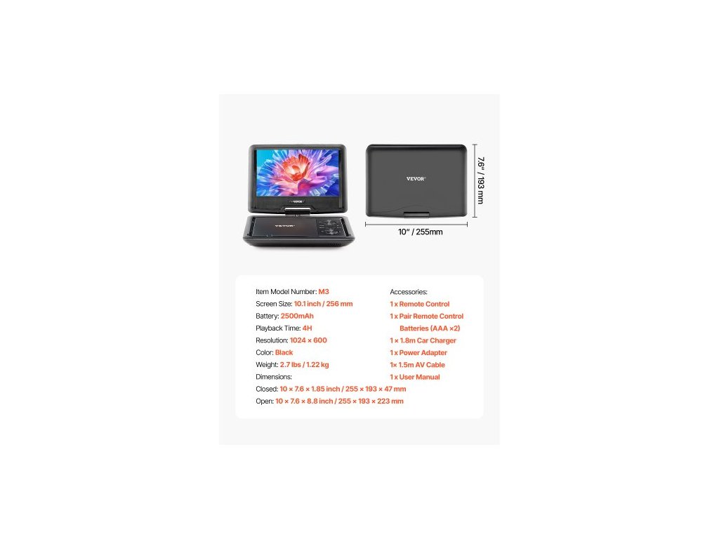 Doba přehrávání: 4 hodiny, Velikost obrazovky: 10,1 palce / 256 mm, Zavřený: 10 x 7,6 x 1,85 palce / 255 x 193 x 47 mm, Baterie: 2500 mAh, Barva: Černá, Číslo modelu položky: M3, Rozměry:, Hmotnost: 2,7 lbs / 1,22 kg, Rozlišení: 1024 x 600, Otevřený: 10 x 7,6 x 8,8 palce / 255 × 193 × 223 mm