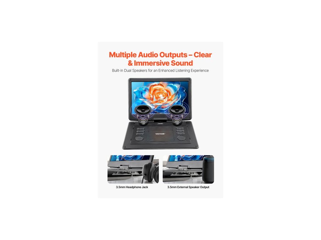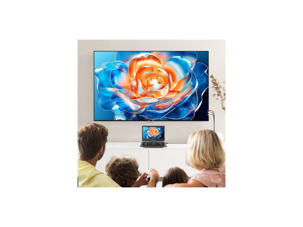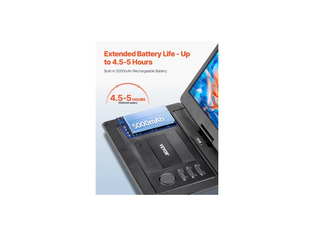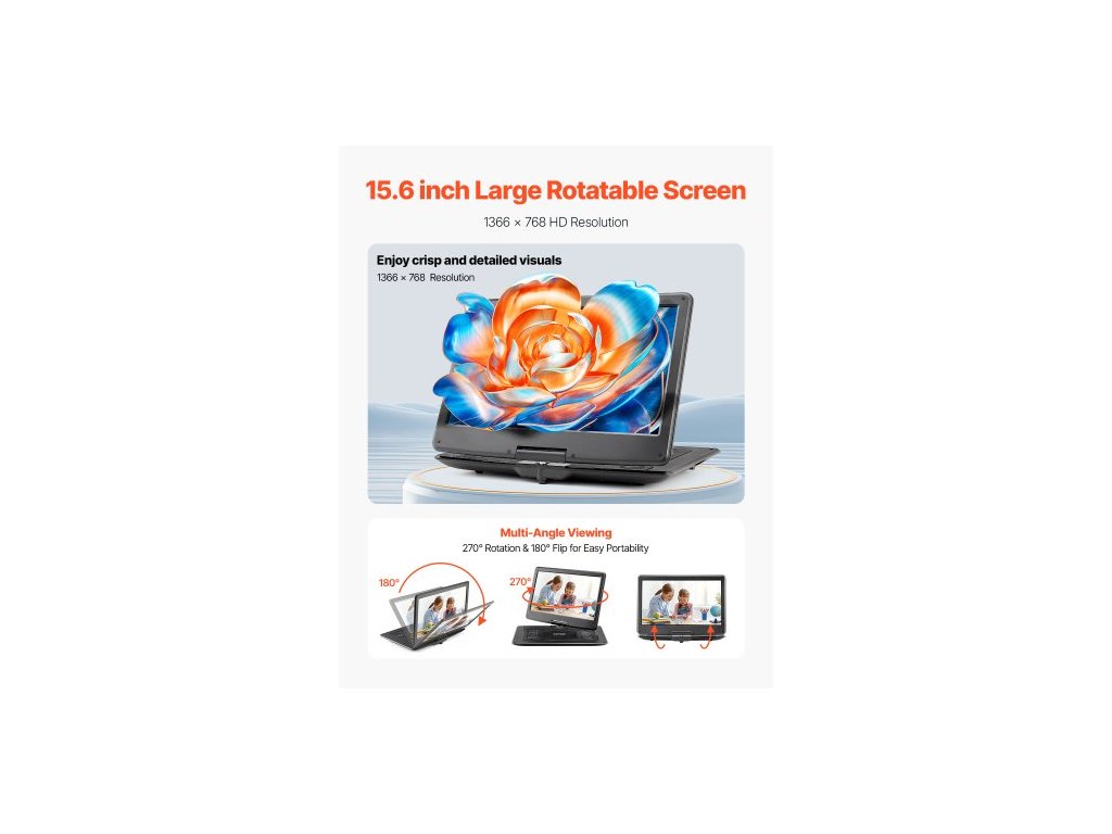 Přenosný DVD přehrávač , otočný 15,6" HD displej, vestavěná dobíjecí baterie 4,5-5 H, dva reproduktory, podpora synchronizace TV/USB/SD karty/CD/DVD, nabíječka do auta, napájecí adaptér, dálkové ovládáníPřenosný DVD přehrávač