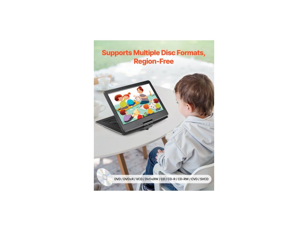 Přenosný DVD přehrávač , otočný 15,6palcový HD displej, vestavěná dobíjecí baterie 4,5-5 H, dva reproduktory, podpora synchronizace TV/USB/SD karty/CD/DVD, nabíječka do auta, napájecí adaptér, dálkové ovládání