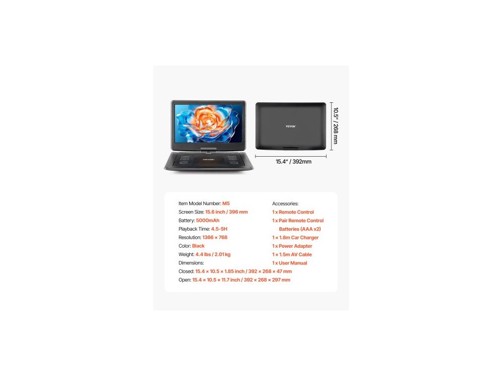Doba přehrávání: 4,5-5H,Velikost obrazovky: 15,6 palce / 396 mm,Zavřený: 15,4 x 10,5 x 1,85 palce / 392 x 268 x 47 mm,Baterie: 5000mAh,Barva: Černá,Číslo modelu položky: M5,Rozměry:,Hmotnost: 4,4 lbs / 2,01 kg,Rozlišení: 1366 x 768,Otevřený: 15,4 x 10,5 x 11,7 palce / 392 x 268 x 297 mm