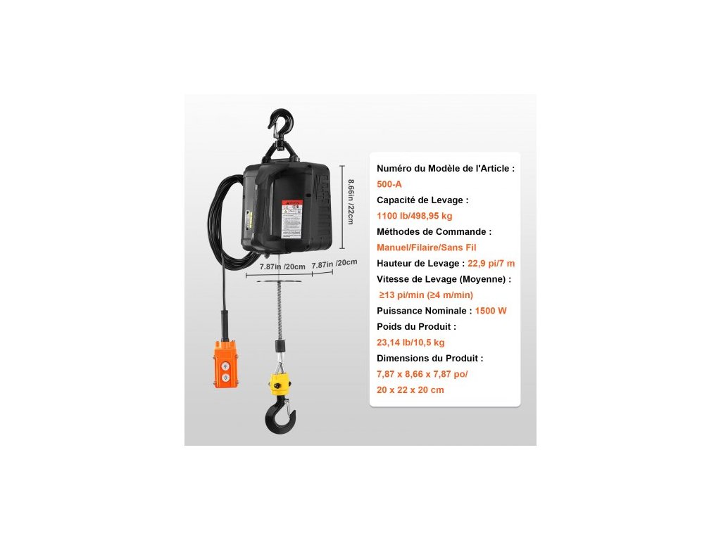 Výška zdvihu: 7 m, Rychlost zdvihu (průměrná): ≥4 m/min, Nosnost: 498,95 kg, Číslo modelu položky: 500-A, Hmotnost výrobku: 10,5 kg, Jmenovitý výkon: 1500 W, Způsoby ovládání: Ruční/Drátové/Bezdrátové, Rozměry výrobku: 20 x 22 x 20 cm