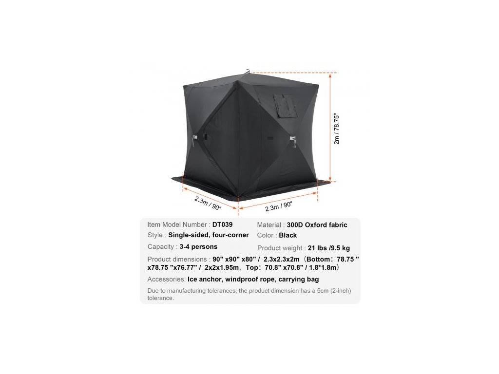Rozměry produktu: 90x90x80 palců / 2,3x2,3x2 m,Kapacita: 3-4 osoby,Horní rozměry: 70,8x70,8 palců / 1,8x1,8 m,Číslo modelu položky: T039,Hmotnost produktu: 21 lbs / 9,5 kg,Materiál: Oxfordská tkanina 300D,Spodní rozměry: 78,75x78,75x76,77 palců / 2x2x1,95 m