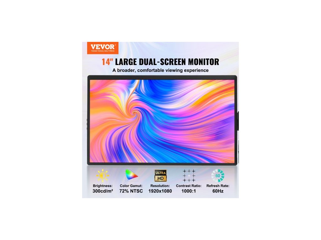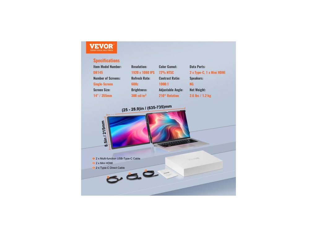 Velikost obrazovky: 14"/355 mm, Jas: 300 cd/m², Obnovovací frekvence: 60 Hz, Reproduktory: NG, Rozměry produktu: (25–28,9 palce) × 8,5 × 0,8 palce/(635–735) × 215 × 20 mm, Kontrastní poměr: 1000:1, Datové porty: 2 x Type-C, 1 x Mini HDMI, Číslo modelu položky: DR145, Počet obrazovek: Jedna obrazovka, Nastavitelný úhel: Otočení 210°, Čistá hmotnost: 2,6 Hmotnost 1,2 kg, barevný gamut: 72 % NTSC, rozlišení: 1920 x 1200 IPS