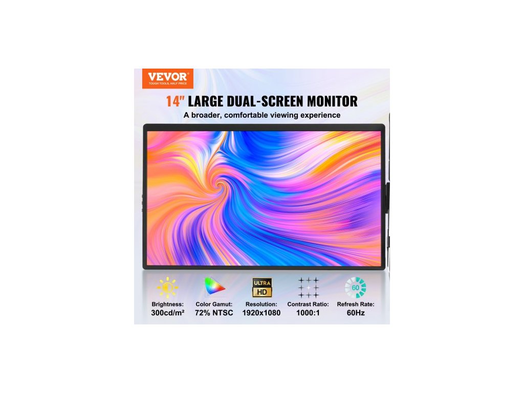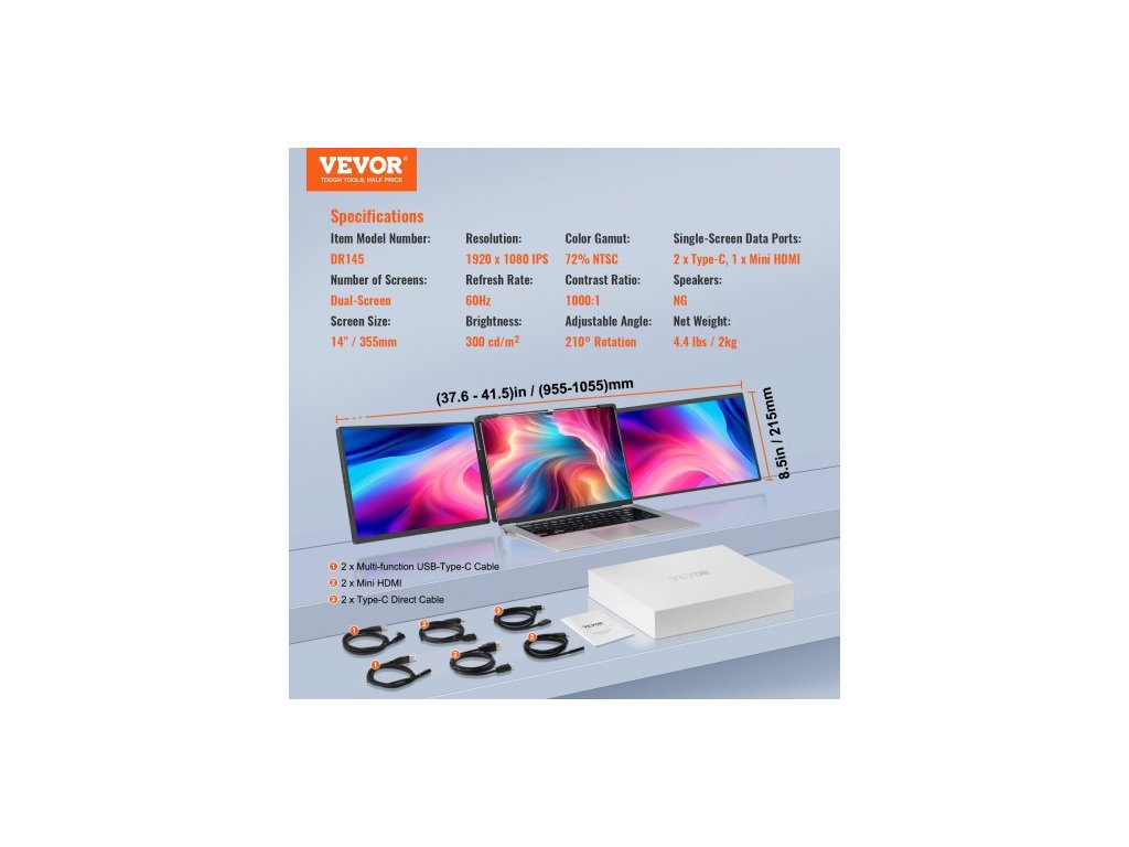 Velikost obrazovky: 14"/355 mm, Jas: 300 cd/m², Obnovovací frekvence: 60 Hz, Reproduktory: NG, Rozměry produktu: (37,6 - 41,5 palce) × 8,5 × 0,8 palce/(955-1055) × 215 × 20 mm, Kontrastní poměr: 1000:1, Datové porty: 2 x Type-C, 1 x Mini HDMI, Číslo modelu položky: DR145, Počet obrazovek: Dvě obrazovky, Nastavitelný úhel: Rotace 210°, Čistá hmotnost: 2 kg, barevný gamut: 72 % NTSC, rozlišení: 1920 x 1200 IPS