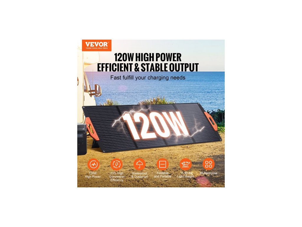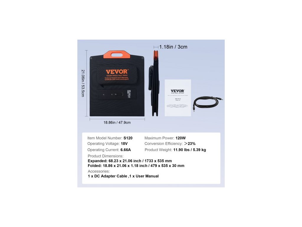 Účinnost konverze: >23 %,Provozní teplota: -10 °C - 65 °C (optimální při 25 °C),Složený: 18,86 x 21,06 x 1,18 palce / 479 x 535 x 30 mm,Maximální výkon: 120 W,Provozní proud: 6,66 A,Rozměry balení: 22,83 x 21,65 x 3,07 palce / 580 x 550 x 78 mm, Provozní napětí: 18 V, Číslo modelu položky: S120, Hmotnost výrobku: 5,39 kg, Rozměry výrobku:, Rozložený: 1733 x 535 mm
