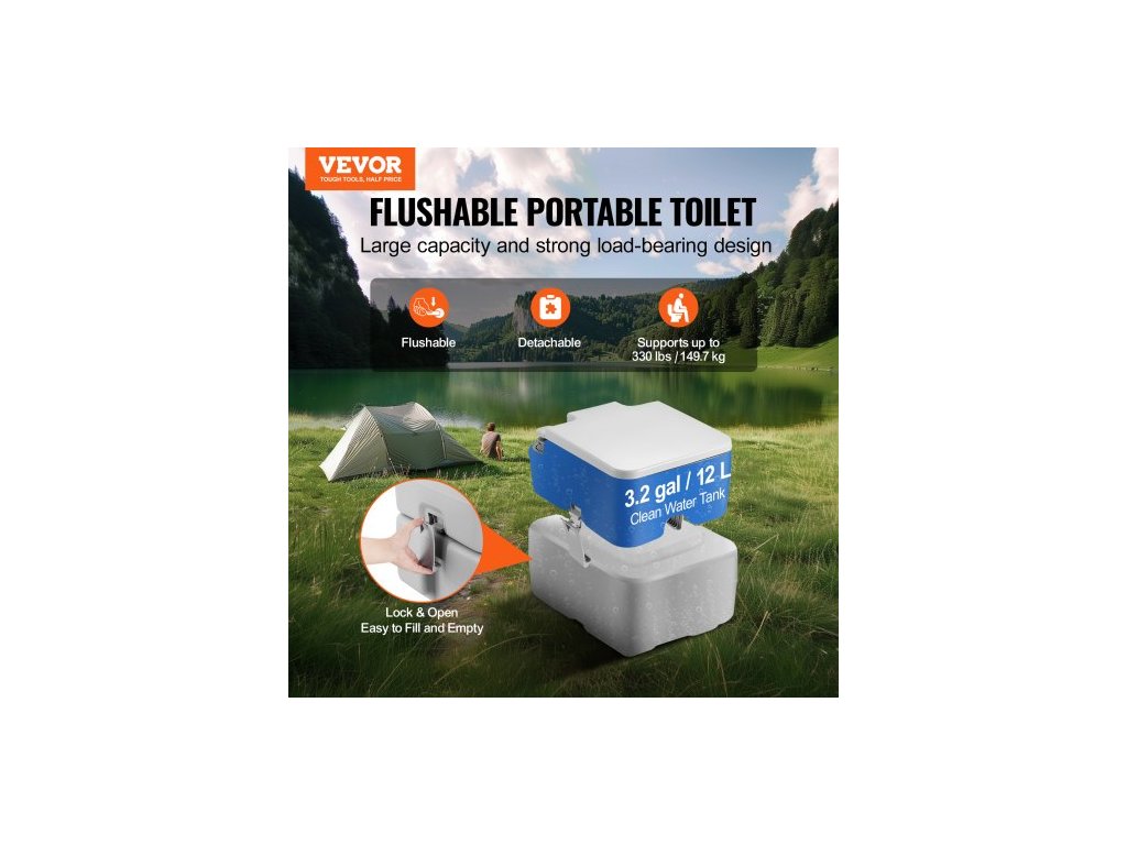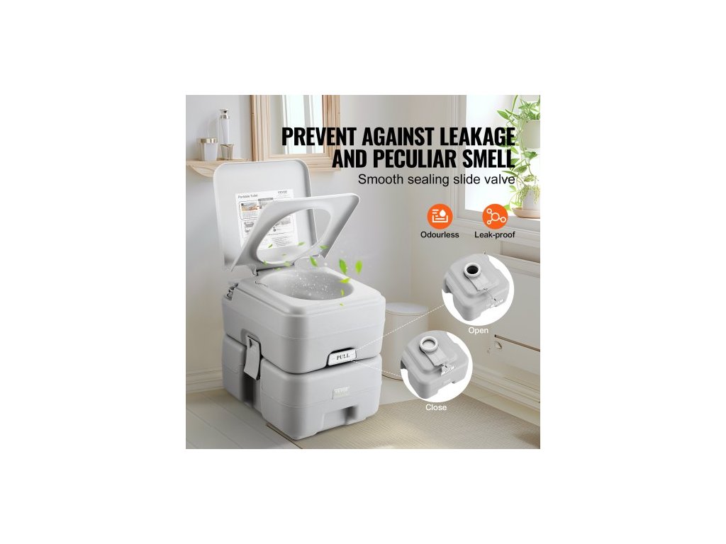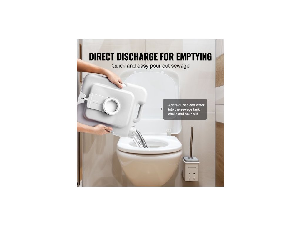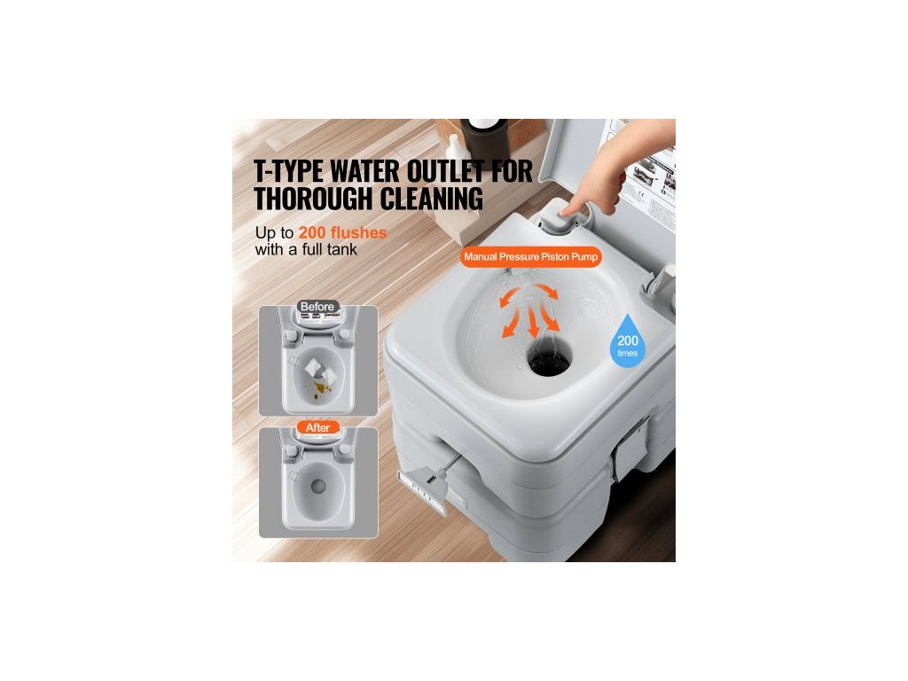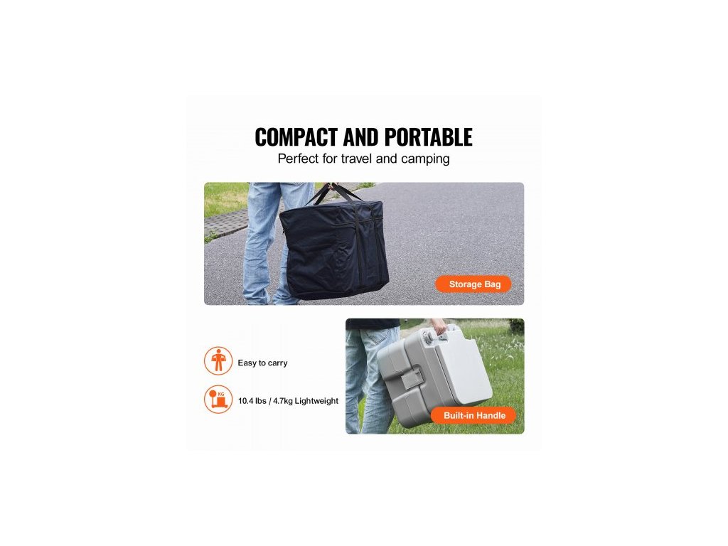 Přenosný splachovací toaletní záchod , cestovní, kempingový, 20,1 l, s přepravní taškou, velký splachovací záchod, účinné tlakové splachování, těsná nádrž na odpad, 5 000 splachování, pohodlné a stabilní, snadné použití, odnímatelná konstrukce, objem nádrže na odpadní vodu: 20 l, životnost: ruční čerpadlo lze spustit 10 000krát, ventil pro vypouštění odpadní vody lze spustit 5 000krát, objem nádrže na vodu: 12 l, nosnost: 149,7 kg, materiály: PP, ABS, HDPE atd., číslo modelu: vzduchové čerpadlo 20 l, vzduchotěsnost: po naplnění vodou a ponechání 12 hodin nedochází k úniku, počet spláchnutí: 200, spotřeba vody na jedno spláchnutí: 70–240 ml 80 ml, Čistá hmotnost: 4,7 kg, Rozměry výrobku: 430 x 340 x 420 mmDoplňkové parametry