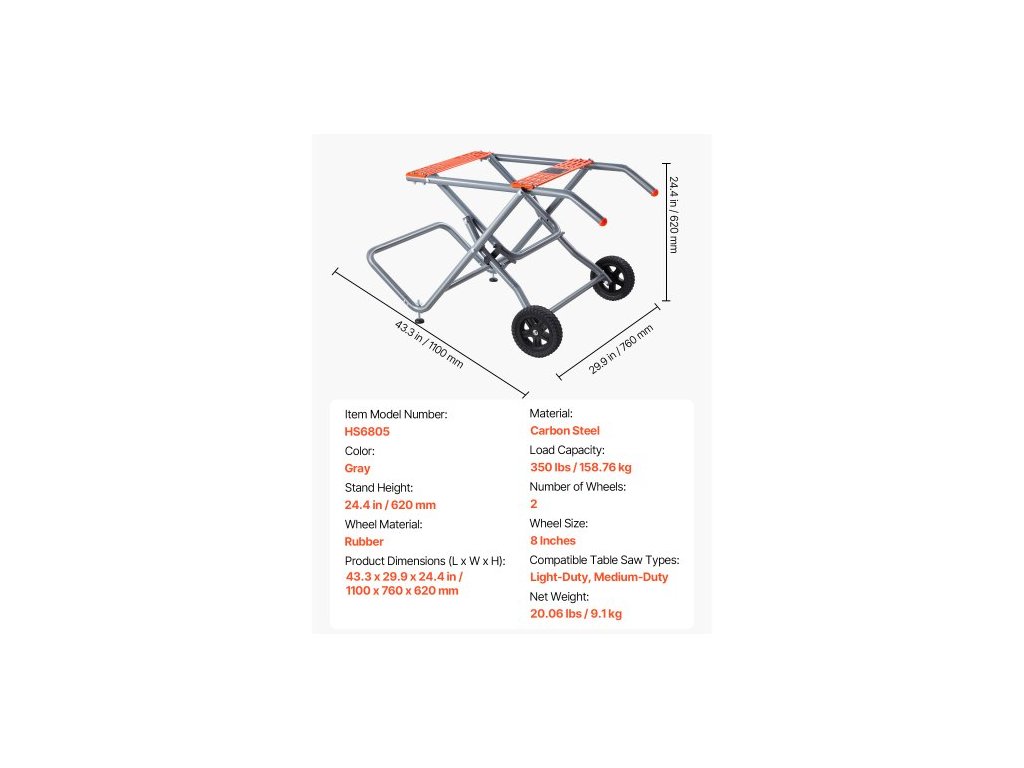 Velikost kol: 8 palců / 203 mm,Kompatibilní typy stolních pil: Lehké, Středně těžké,Nosnost: 350 lbs / 158,76 kg,Barva: Šedá,Číslo modelu položky: HS6805,Materiál: Uhlíková ocel,Rozměry výrobku (D x Š x V): 43,3 x 29,9 x 24,4 palce / 1100 x 760 x 620 mm,Počet koleček: 2,Čistá hmotnost: 9,1 kg, Výška stojanu: 620 mm, Materiál koleček: Guma