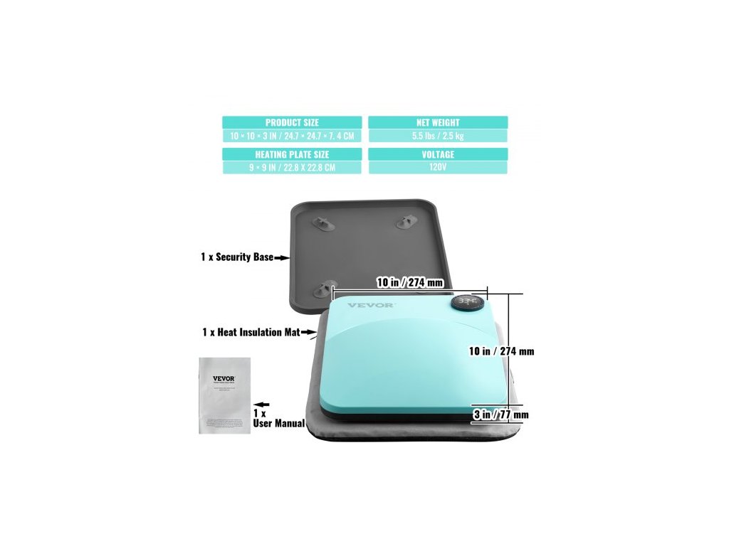 Rozměry topné desky: 9 × 9 palců/22,8 x 22,8 cm,Časový rozsah: 1–999 s,Čistá hmotnost: 5,5 lbs/2,5 kg,Příkon: 670 W,Teplotní rozsah: 40–205 ℃/104–401 ℉,Rozměry produktu: 10 × 10 × 3 palce/24,7 × 24,7 × 7,4 cm