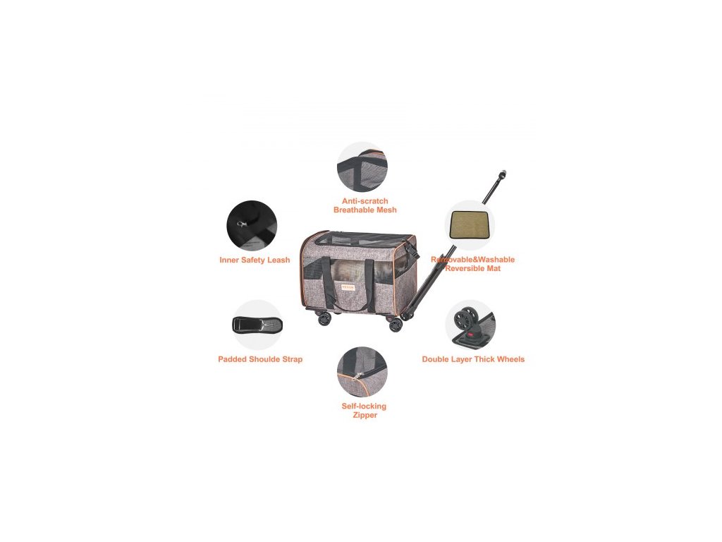 Materiál tažné tyče: Hliníková slitina,Barva: Šedá,Maximální nosnost: 9,9 kg,Zip: Samosvorný zip,Rozměry tašky: 445 x 310 x 300 mm,Úložné kapsy: 2,Síťovaná okénka: 5,Číslo modelu položky: JW-XB21212255 (218),Hmotnost výrobku: 2,8 kg,Výrobní rozměry (DxŠxV): 45 x 30 x 30 cm palce, Průměr koleček: 5,5 cm / 2,1 palce, Počet koleček: 4, Hlavní materiál: Oxfordská tkanina 600D