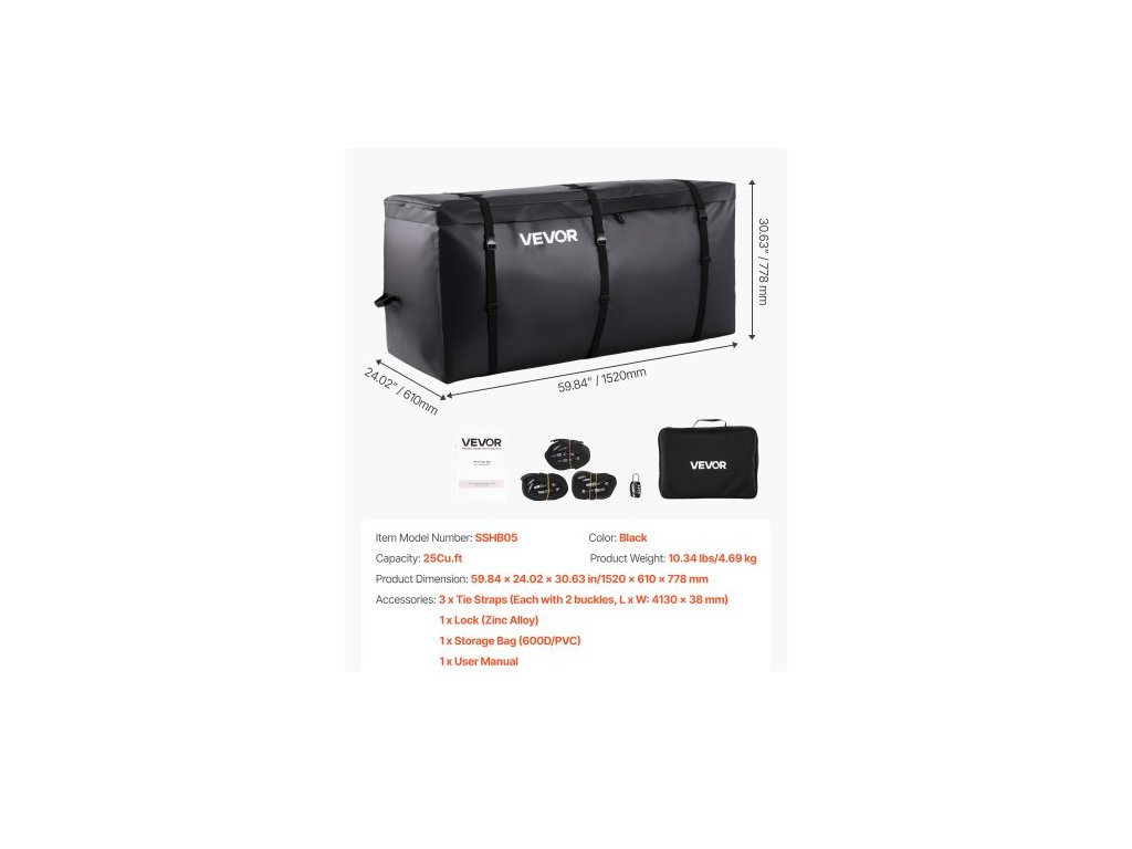 Přepravní taška na tažné zařízení , vodotěsná 840D PVC, 59,84 x 24,02 x 30,63 palce (25 krychlových stop), odolná nákladní taška pro úložný prostor na korbě nákladního vozu s vyztuženými popruhy, vhodná pro tažné koše automobilů, SUV, dodávekExtra velká kapacita