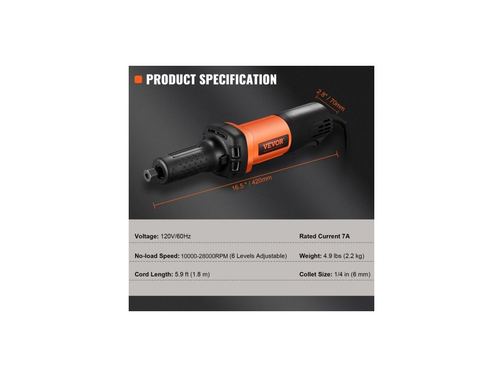 Nastavitelná rychlost: 6 úrovní nastavení,Hladina hluku: ≤90 dB,Velikost kleštiny: 1/4" / 6 mm,Délka kabelu: 5,9 ft (1,8 m),Proud naprázdno: max. 1,65 A,Napětí: 220-240 V 50/60 Hz,Otáčky naprázdno: 7000-30 000 ot./min,Velikost vyměnitelného upínacího náboje: 1/8",Stupeň krytí: IP20,Příkon: 820 W,Hmotnost: 4,2 lbs / 1,9 kg