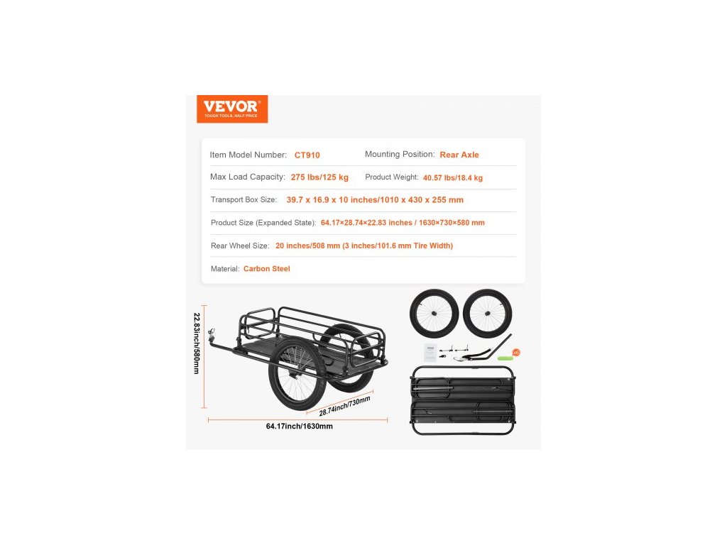Montážní poloha: Zadní náprava, rozměry výrobku (rozložený stav): 1630 x 730 x 580 mm, rozměry přepravního boxu: 1010 x 430 x 255 mm, rozměr zadních kol: 508 mm (pneumatika 76,2 mm) Šířka), Číslo modelu položky: CT910, Hmotnost produktu: 18,4 kg, Maximální nosnost: 125 kg, Materiál: Uhlíková ocel