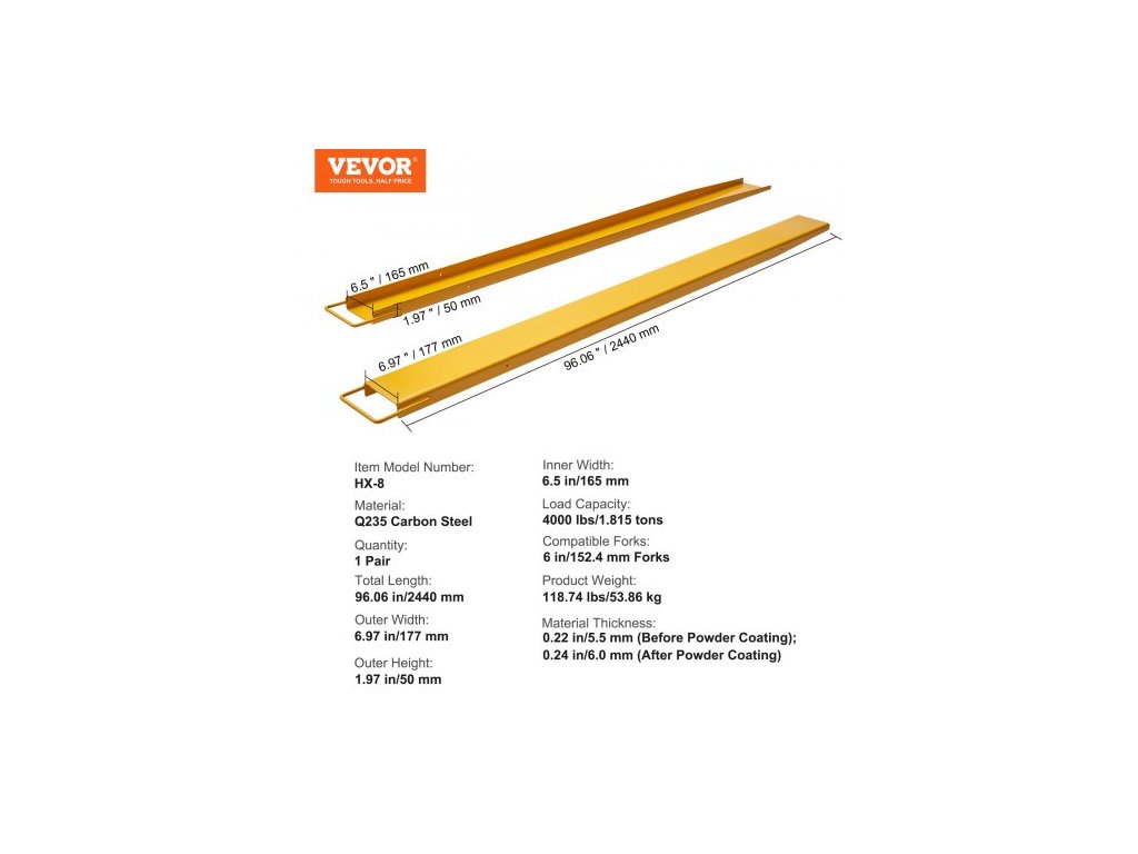 Celková délka: 96,06 palce/2440 mm,Vnější výška: 1,97 palce/50 mm,Nosnost: 4000 liber/1,815 tuny,Kompatibilní vidle: Vidle 6 palců/152,4 mm,Číslo modelu položky: HX-8,Vnější šířka: 6,97 palce/177 mm,Hmotnost výrobku: 118,74 liber/53,86 kg,Množství: 1 Pár, Materiál: Uhlíková ocel Q235, Vnitřní šířka: 6,5 palce/165 mm