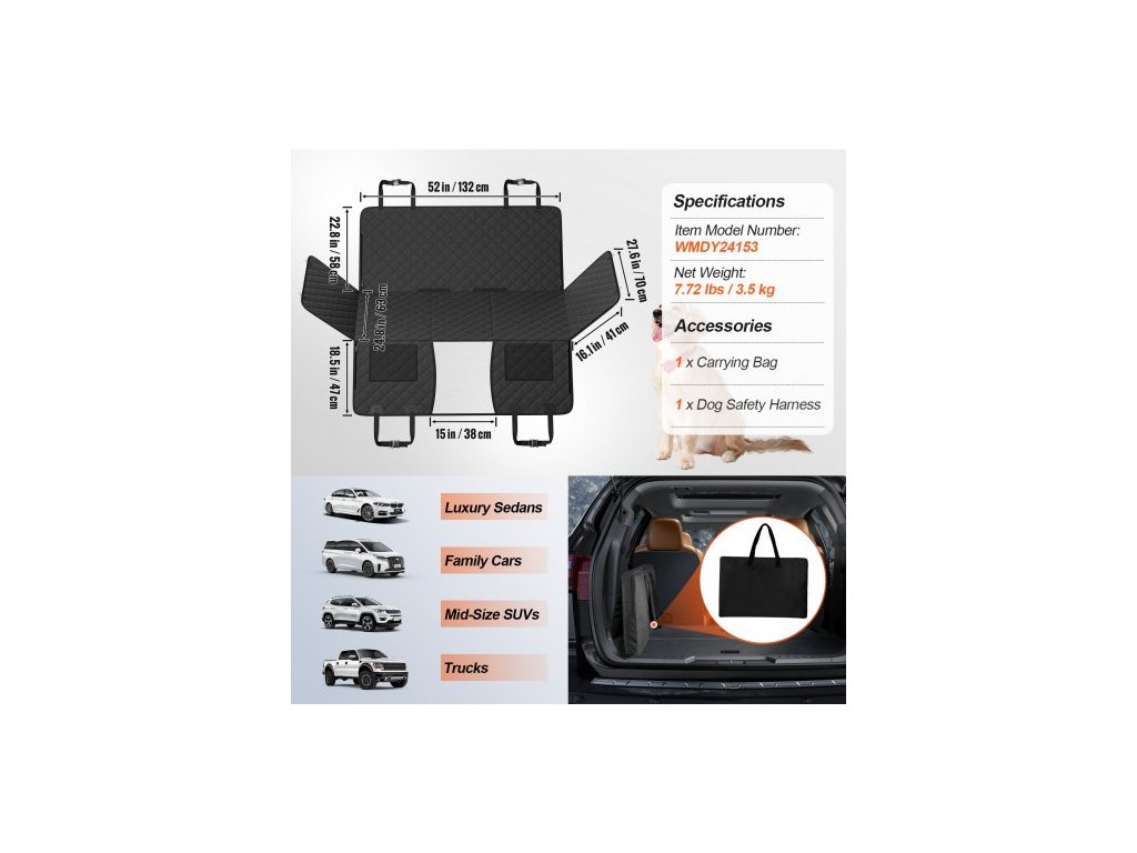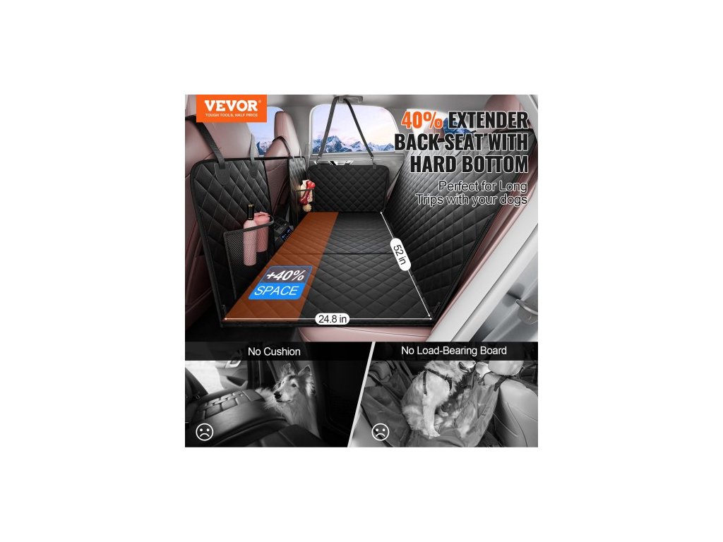 Prodloužení zadního sedadla pro psy, Houpací síť pro psy na zadní sedadlo auta, Potah na autosedačku pro psy s tvrdým dnem 52"x24,8", Nosnost 350 liber se síťovaným okénkem a úložnou kapsou pro auto, SUVKompatibilní s více vozidly