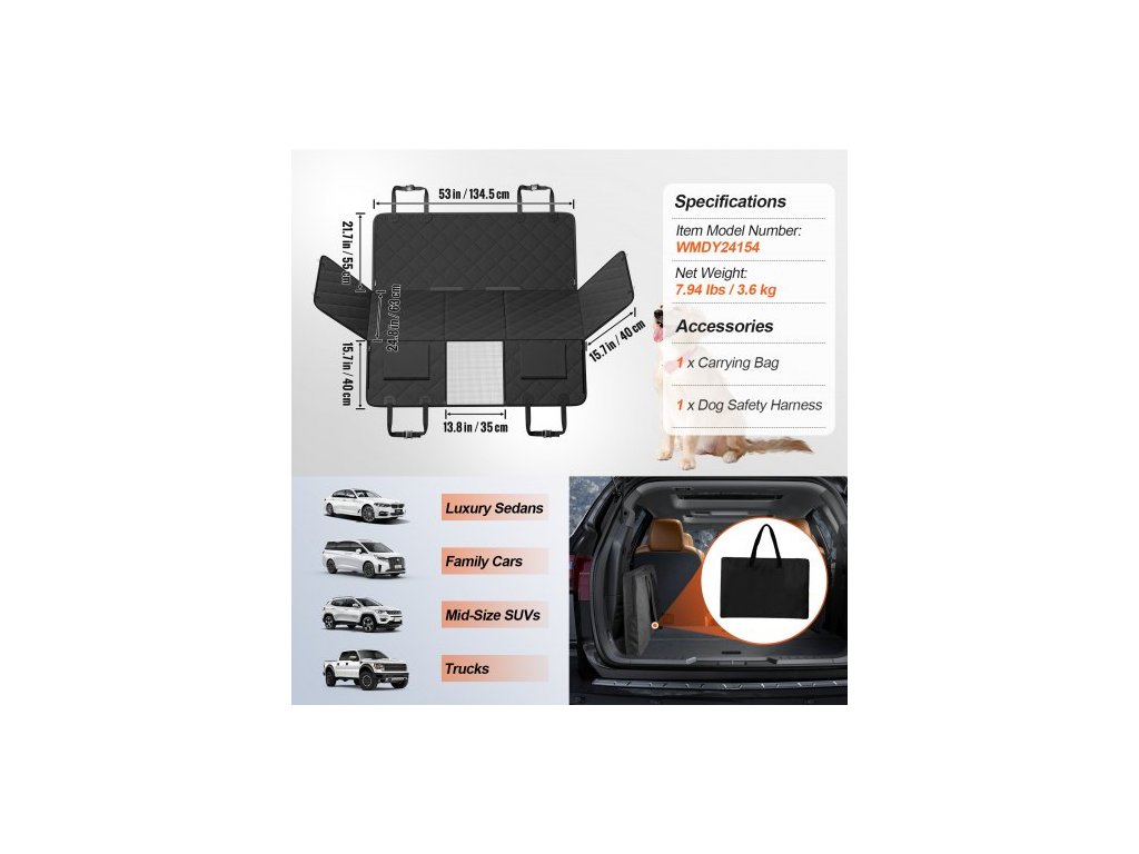 Prodloužení zadního sedadla pro psy, houpací síť pro psy na zadní sedadlo auta, potah na psí autosedačku s tvrdým dnem, pelíšek do autosedačky 53"x24,8", nosnost 350 liber, síťované okénko a úložná kapsa pro auto, SUV, nákladní vůzKompatibilní s více vozidly