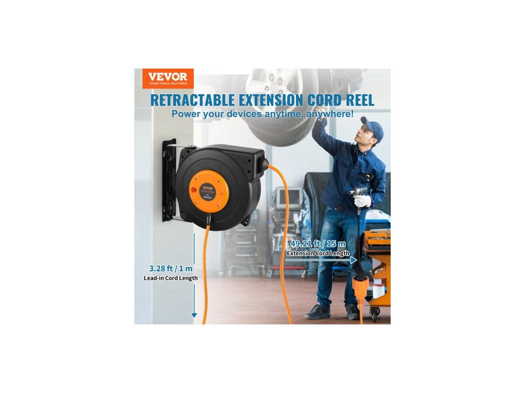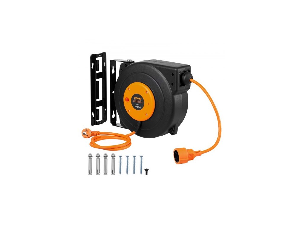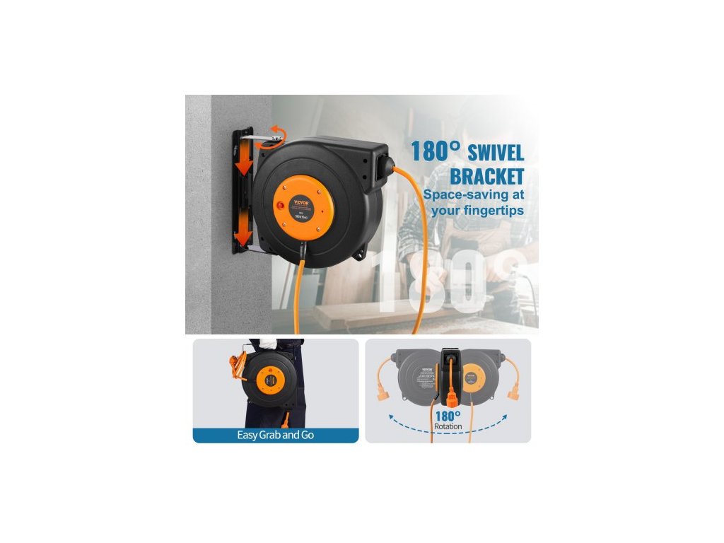 Navíjecí prodlužovací kabel na cívce, 15 m, 1600W odolný navíjecí napájecí kabel s přívodním kabelem o délce 1 m, ochrana proti přehřátí, PP plášť, otočný držák o 180° pro montáž na strop nebo na stěnuSnadný přístup k elektřině