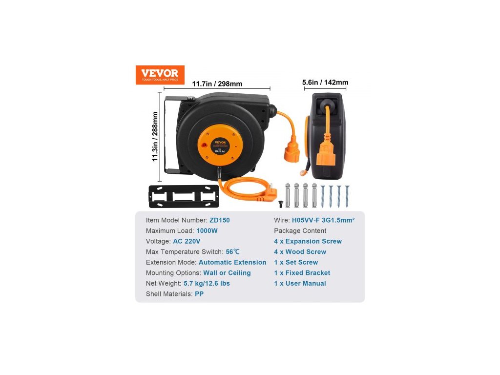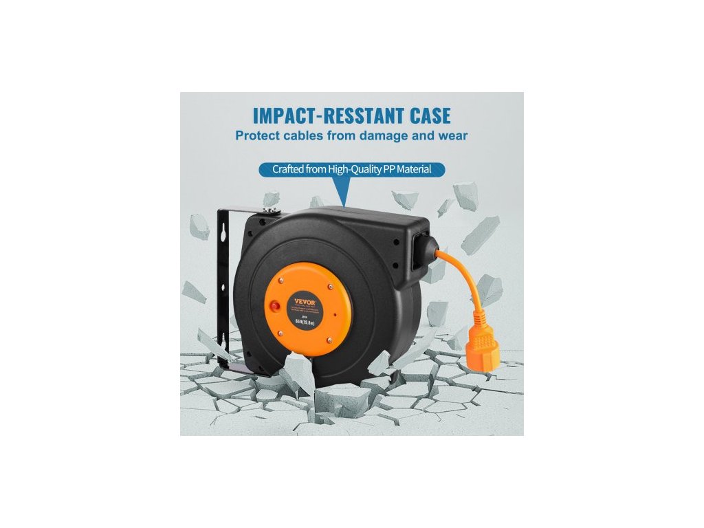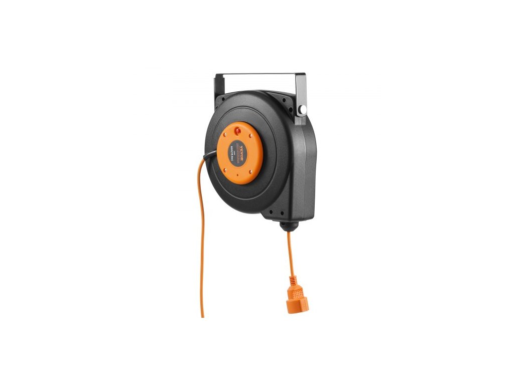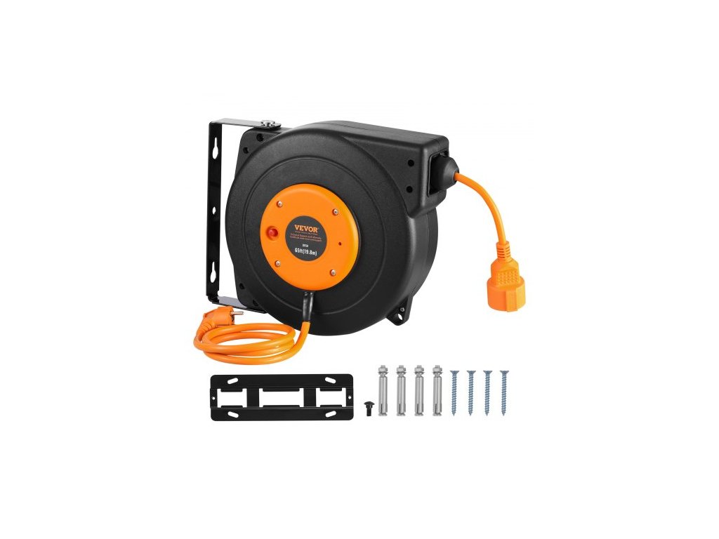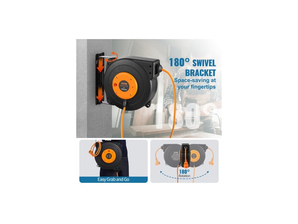 Navíjecí prodlužovací kabel na cívce, 19 m, 1000W odolný navíjecí napájecí kabel s přívodním kabelem o délce 1 m, ochrana proti přehřátí, PP plášť, otočný držák o 180° pro montáž na strop nebo na stěnuSnadný přístup k elektřině