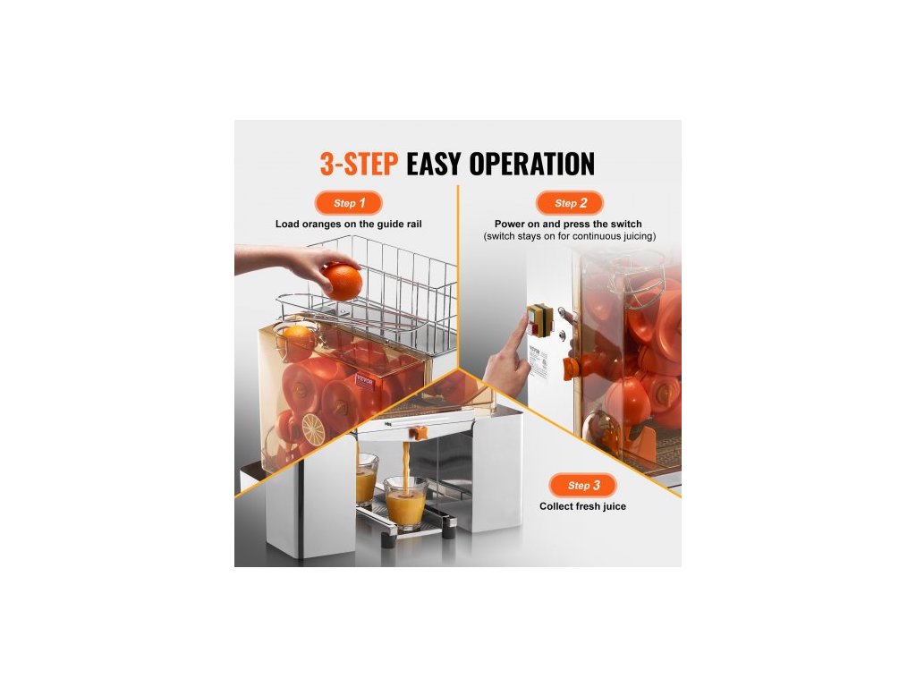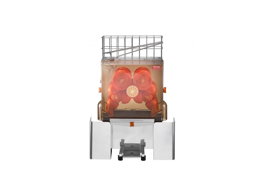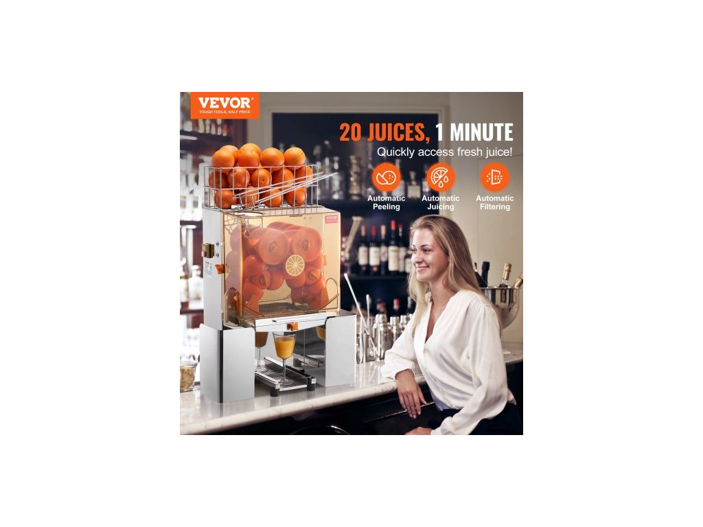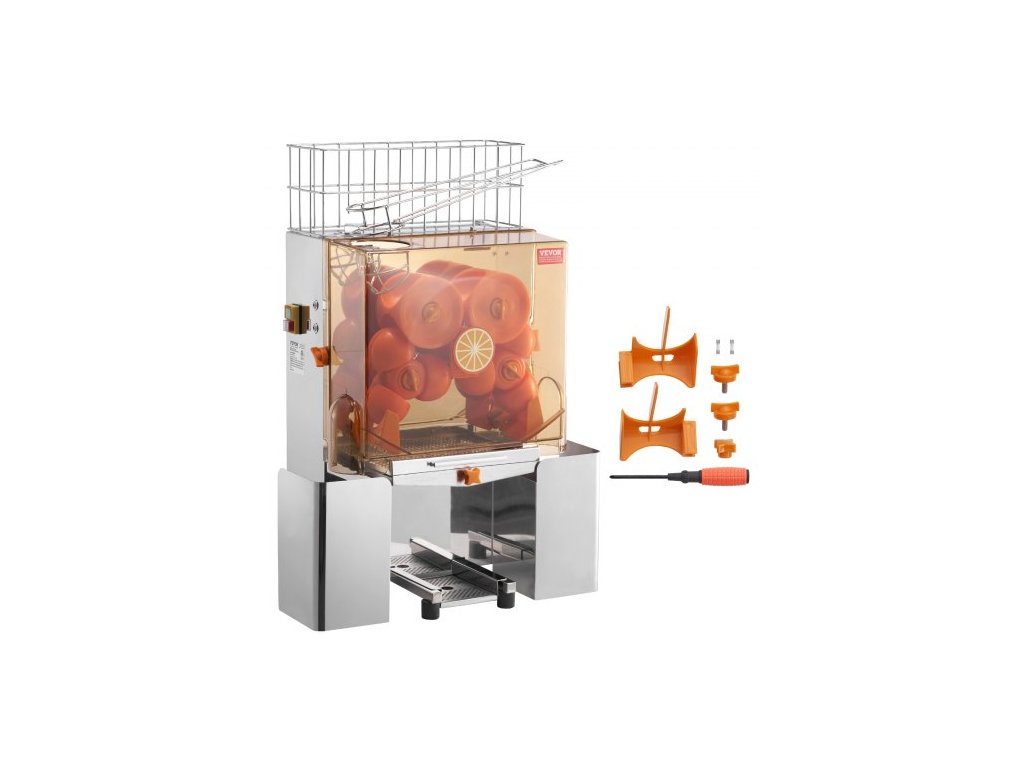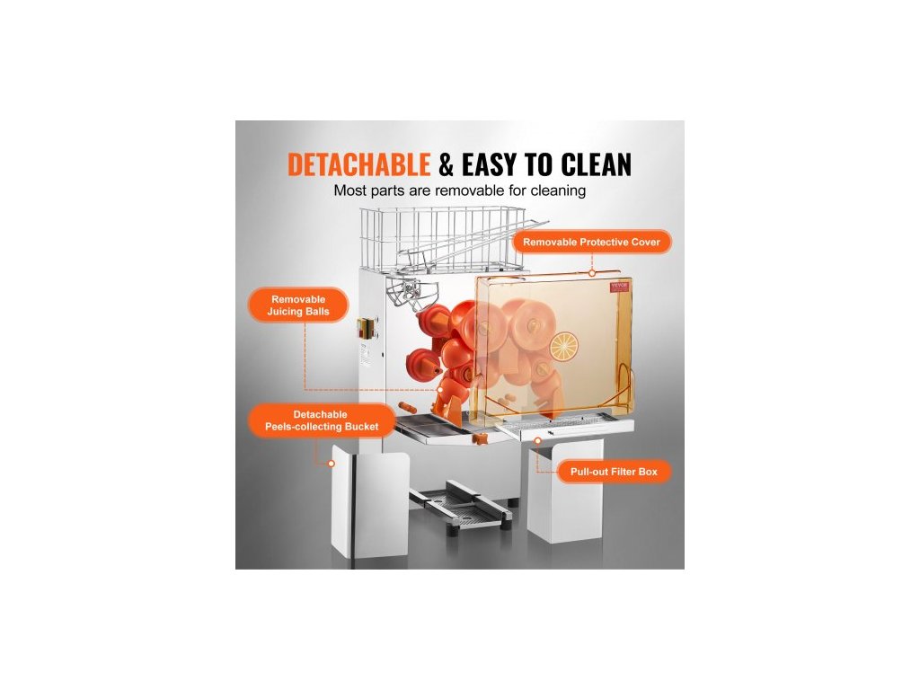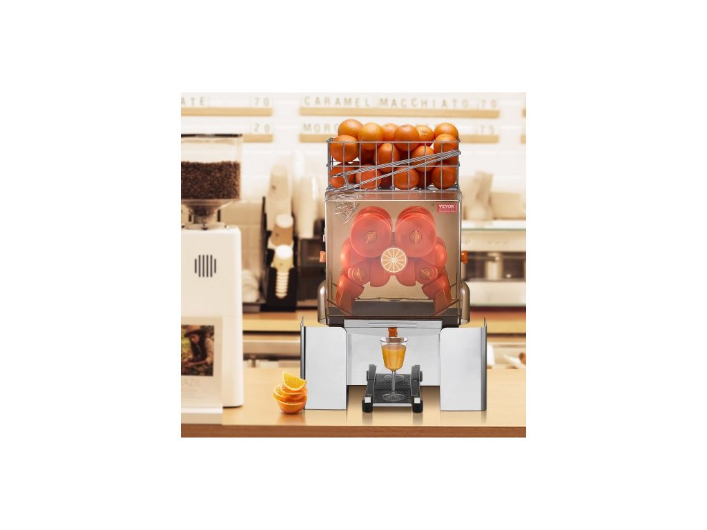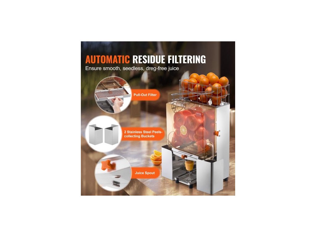 Komerční odšťavňovač pomerančů , automatický odšťavňovač 120 W, nerezový odšťavňovač pomerančů pro 20 pomerančů za minutu, s výsuvným filtrem, kryt z PC, 2 sběrné nádoby na slupkuPrémiová kvalita