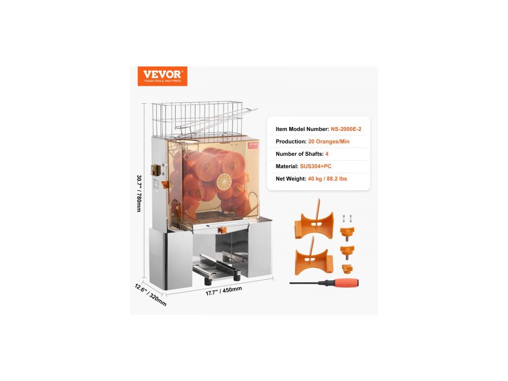 Produkce: 20 pomerančů/min, Číslo modelu položky: NS-2000E-2, Počet hřídelí: 4, Materiál: SUS304+PC, Rozměry výrobku: 17,7 x 12,6 x 30,7 palce/450 x 320 x 780 mm, Čistá hmotnost: 40 kg / 88,2 lbs