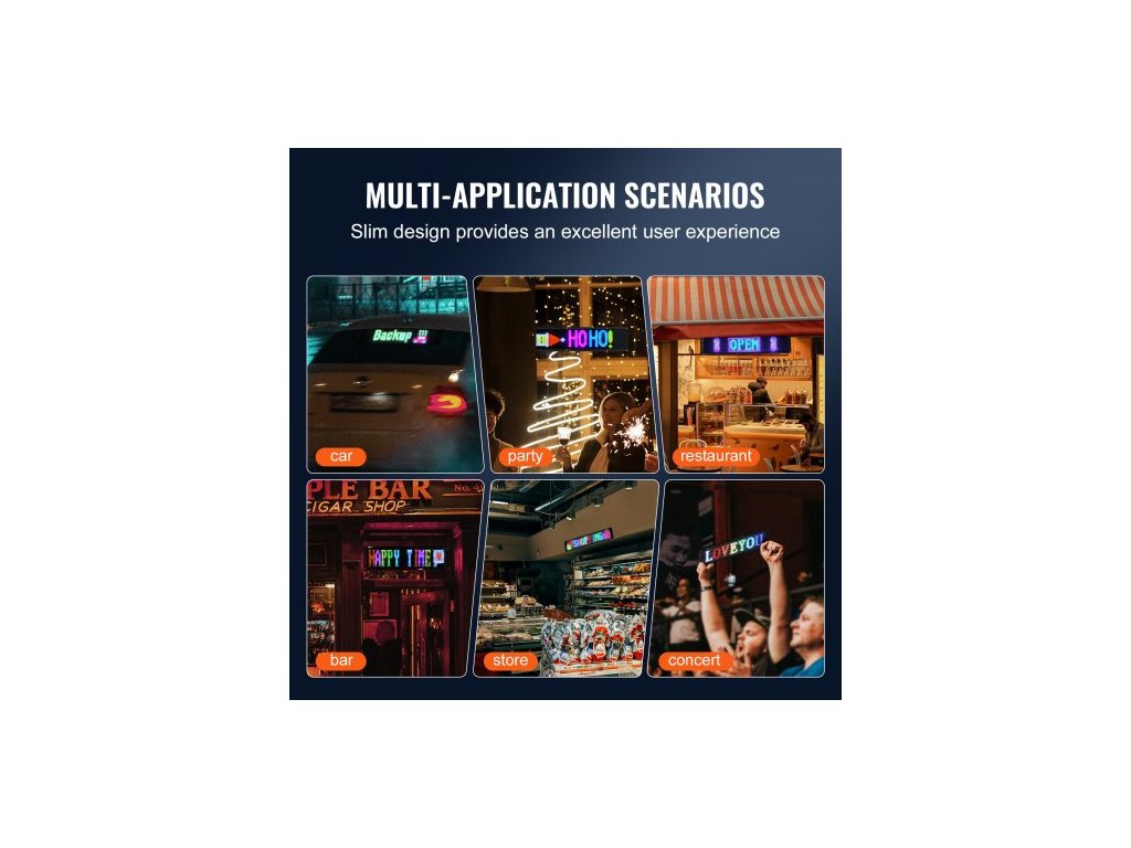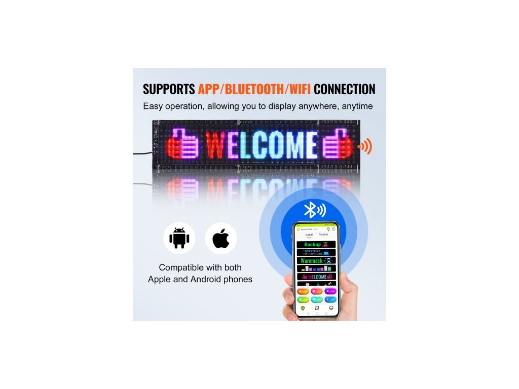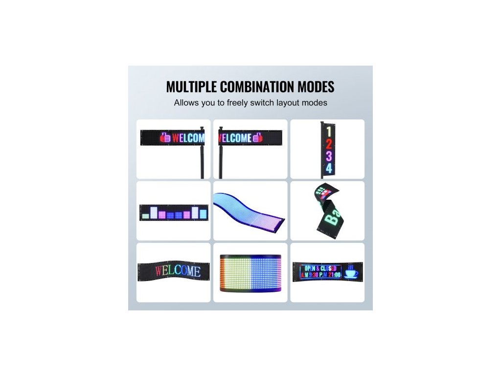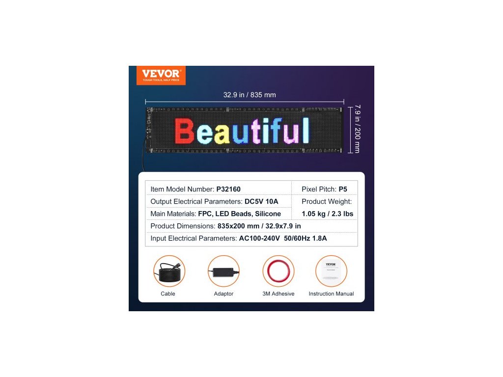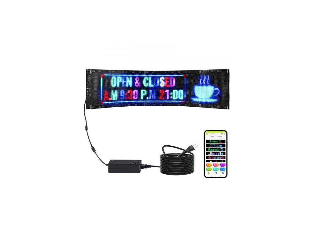 Programovatelný LED displej , P5 barevný LED rolovací panel, DIY zobrazovací deska s animací textu, Bluetooth ovládání přes aplikaci, reklama na obchod, 83,5x20cm, vysoký jas, funkce přizpůsobení, inteligentní ovládání přes aplikaci, stovky kombinovaných režimů, široké použití, pohodlná instalace a použití, rozteč pixelů: P5, hlavní materiály: FPC, LED korálky, silikon, číslo modelu: P32160, hmotnost výrobku: 1,05 kg / 2,3 lbs, rozměry výrobku: 835x200 mm / 32,9x7,9 palceDoplňkové parametry