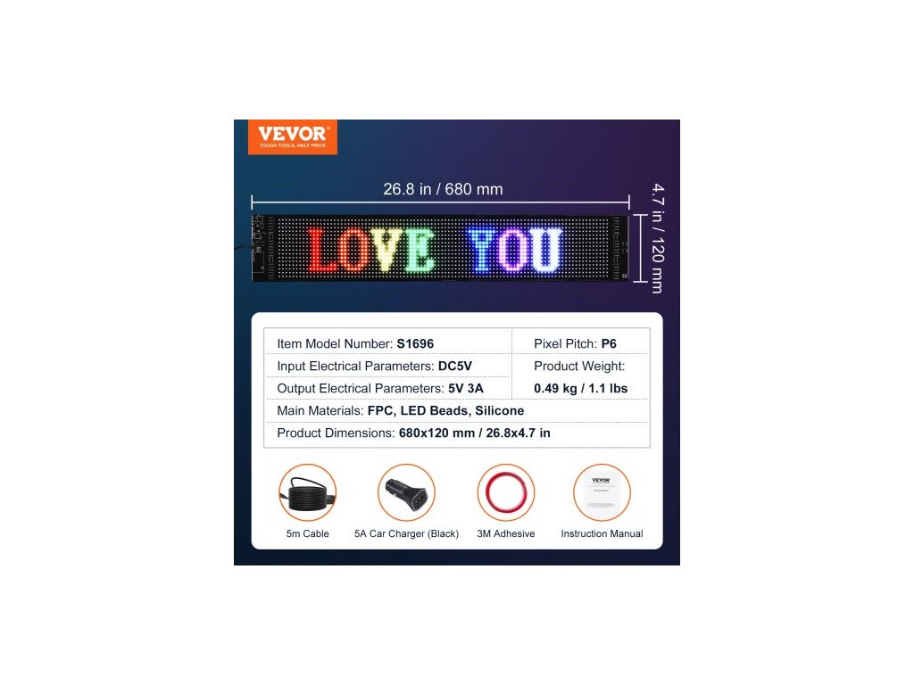 Rozteč pixelů: P6,Hlavní materiály: FPC, LED korálky, silikon,Číslo modelu položky: S1696,Hmotnost výrobku: 0,49 kg / 1,1 lbs,Rozměry výrobku: 680x120 mm / 26,8x4,7 palce