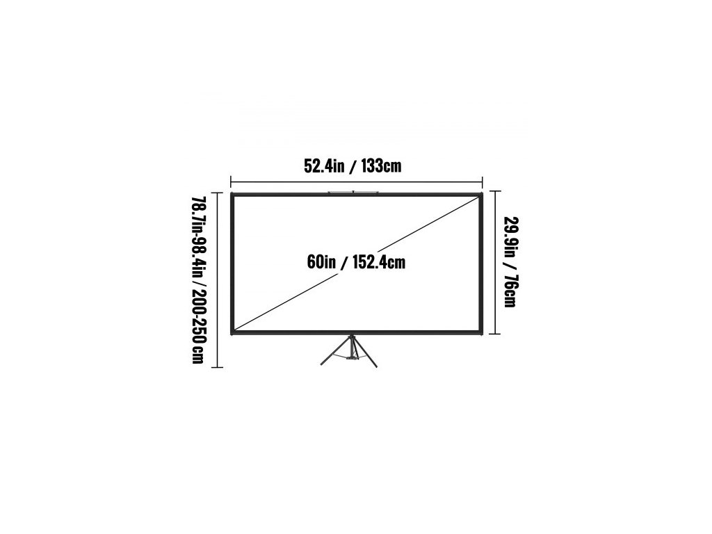 Rozlišení obrazovky: 4K HD,Materiál stativu: Hliníková slitina,Typ stojanu: Stativ,Úhlopříčka: 60"/152,4 cm,Pozorovací úhel: 160 stupňů,Materiál obrazovky: Polyester,Model: DM-ABS-60,Hmotnost výrobku: 14,3 lbs/6,5 kg,Výška stojanu: 78,7"-98,4"/200-250 cm (nastavitelné),Poměr stran: 16:9,Oblast obrazu (Š x V): 52,4" x 29,9" / 133 x 76 cm