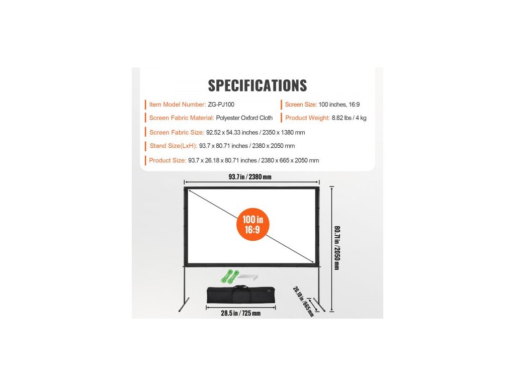 Rozměry stojanu (DxV): 93,7 x 80,71 palců / 2380 x 2050 mm,Velikost plátna: 100 palců, 16:9,Číslo modelu položky: ZG-PJ100,Hmotnost výrobku: 8,82 lbs / 4 kg,Rozměry látky plátna: 92,52 x 54,33 palců / 2350 x 1380 mm,Materiál látky plátna: Polyesterová oxfordská tkanina,Rozměry výrobku: 93,7 x 26,18 x 80,71 palce / 2380 x 665 x 2050 mm